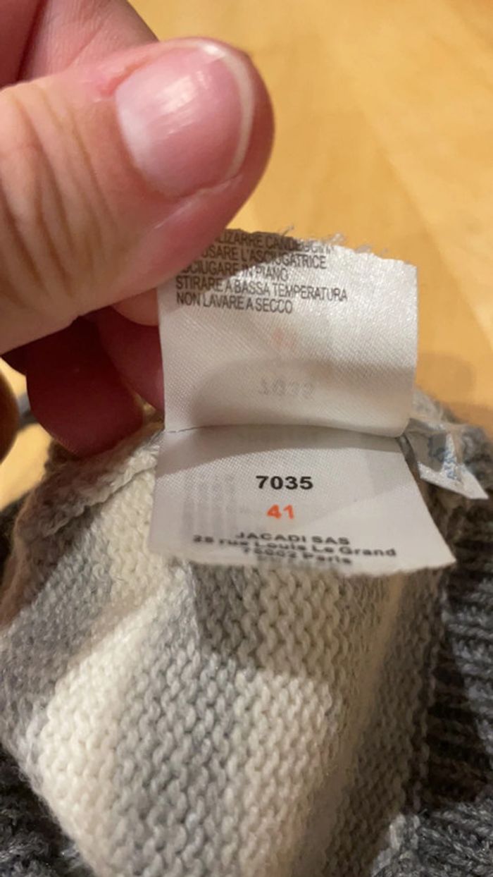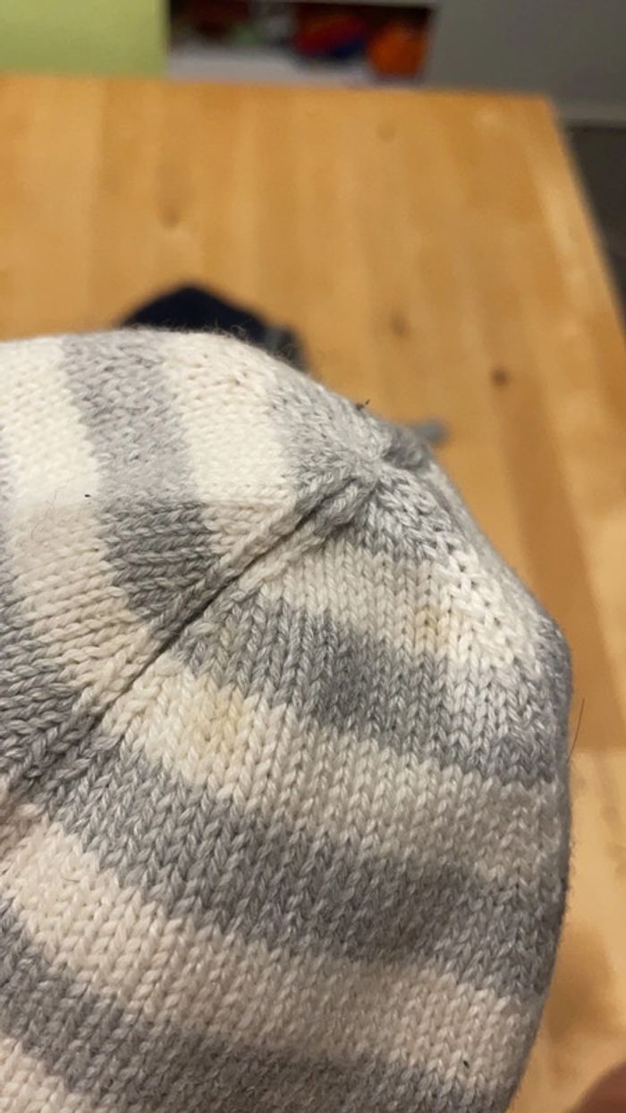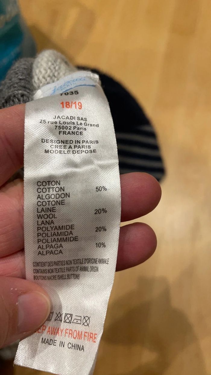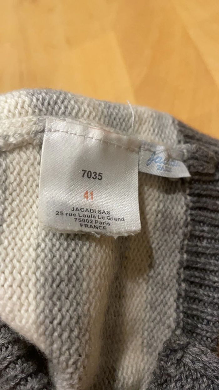 Une paire de bottons bébé taille 18/19 de marque jacadi et coton laine polyamide alpaga rayés gris et blancs assortis au bonnet de la même marque taille 41 pour tenir la tête et les pieds de bébé au chaud. A noter qu’il y a des taches peu visibles sur le bonnet (dernières photos, traces légèrement jaunes) Je mets avec un bonnet plus grand réversible Obaïbi tout doux en polaire