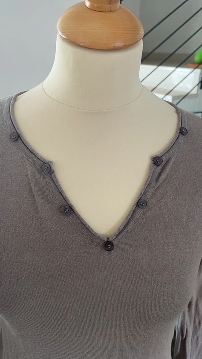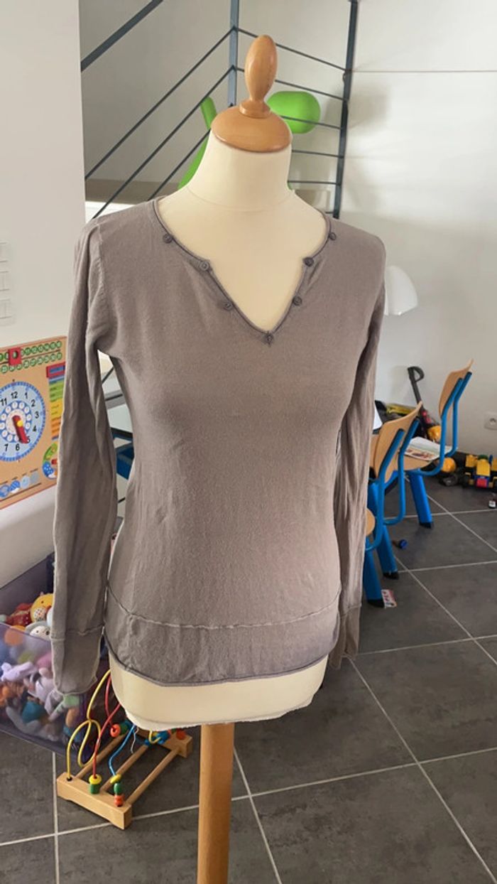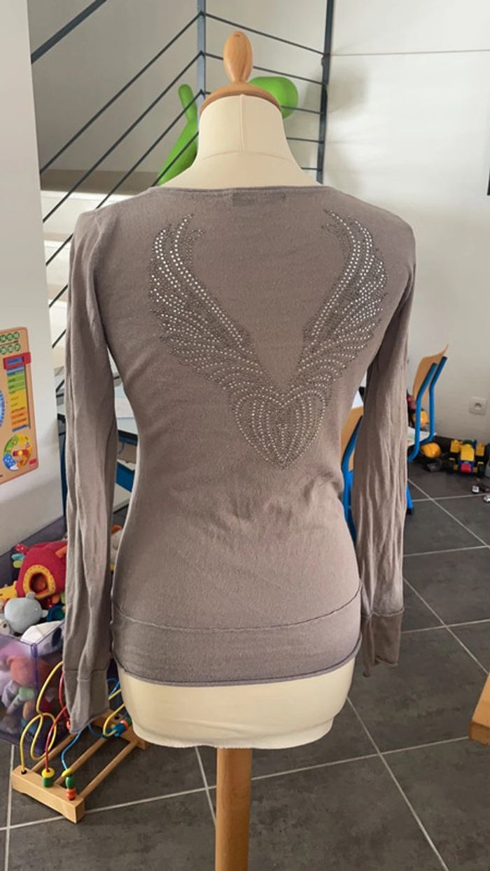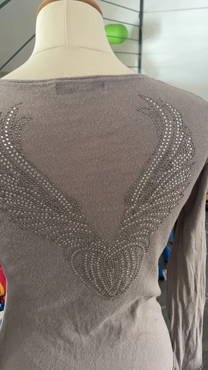 Joli haut léger it hippie Porté mais encore en bon état Joli décor en strass dans le dos Et encolure décorée de boutons Plus d’étiquette de taille mais mon mannequin taille du 38