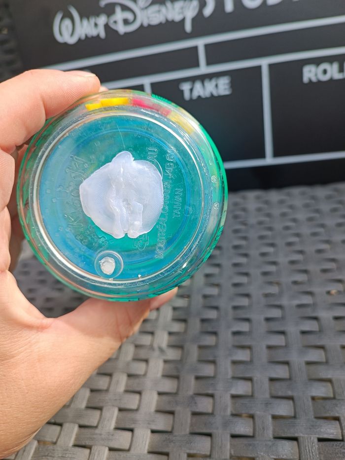 La gourde est en très bon état général mais le dessous a été colmaté grossièrement car il y a avais une fuite de la double paroi Avec eau paillettes et petits poissons flottants
