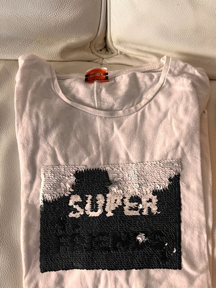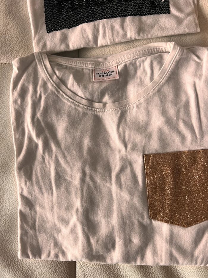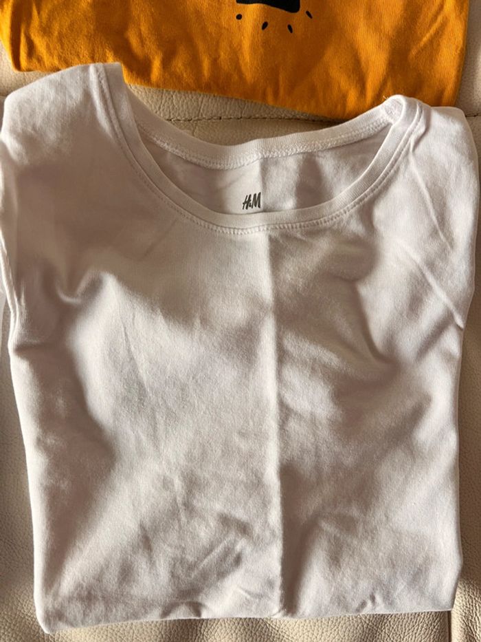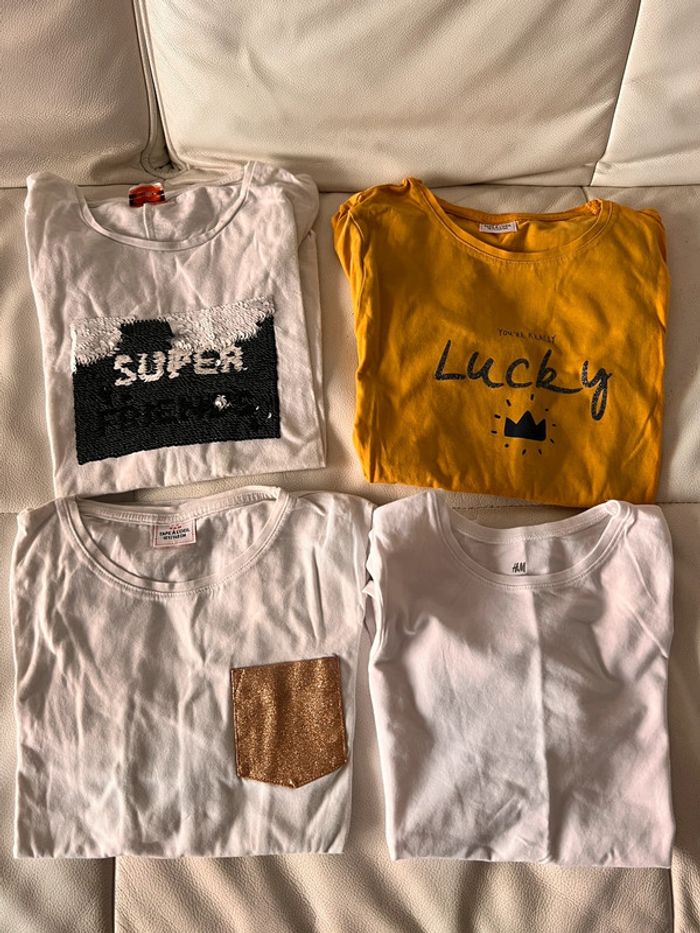 Lot de 4 t shirt manches longues 10 ans Un blanc uni H&M neuf jamais porté Un blanc avec strass qui change de motif et couleur TAO Un moutarde Un blanc avec poche dorée Possible de prendre à l’unité