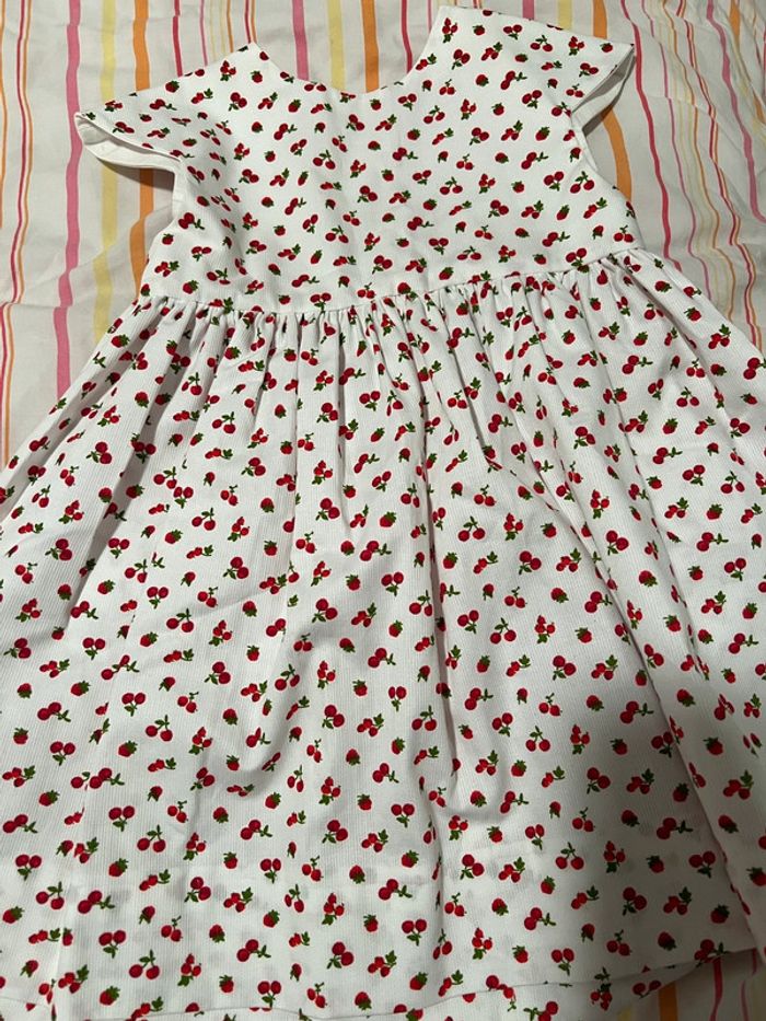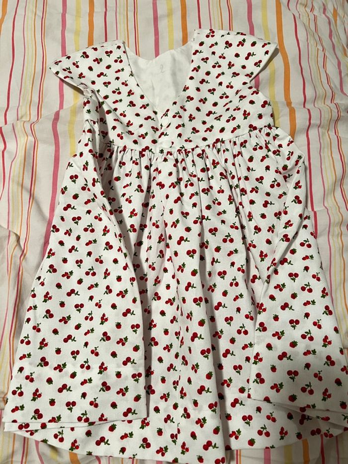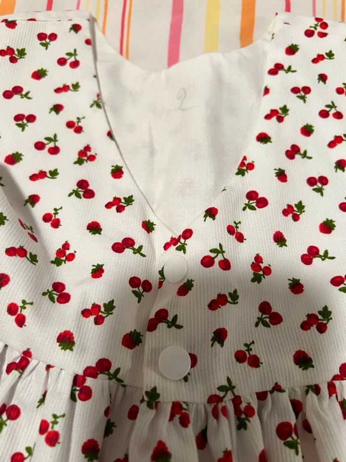 Robe neuve sans étiquette Jamais portée indiqué 2 je pense que c’est 18-24 mois Joli motif cerises Hauteur épaule bas de la robe environ 53 cm
