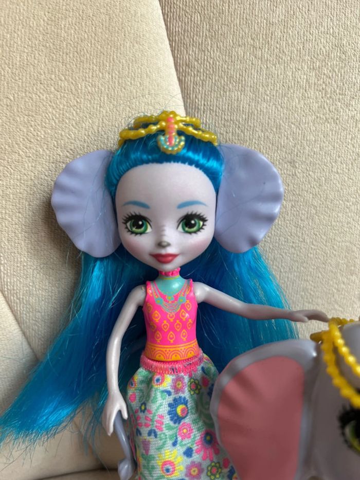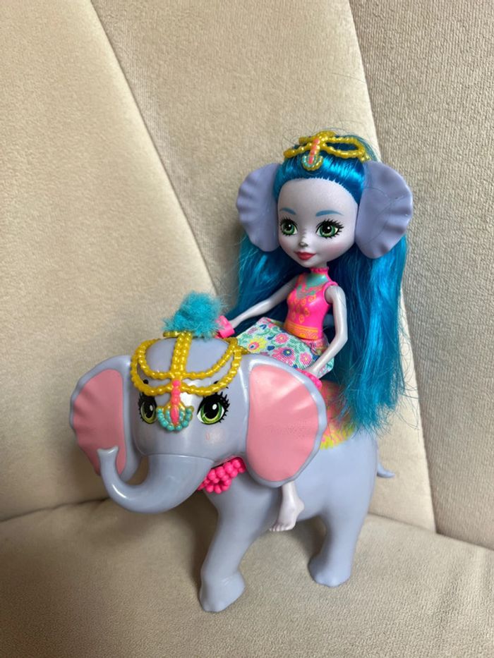 Très bon état, manque chaussures Coffret Ekaterina éléphant et antic - Un coffret une mini-poupée de 15cm avec un grand éléphant. L'articulation aux genoux de la mini-poupée favorise la balade sur le dos de l'animal. #jeuxenfants_aria2014 #mattel #enchantimals #ekaterinaelephant #poupee15cm