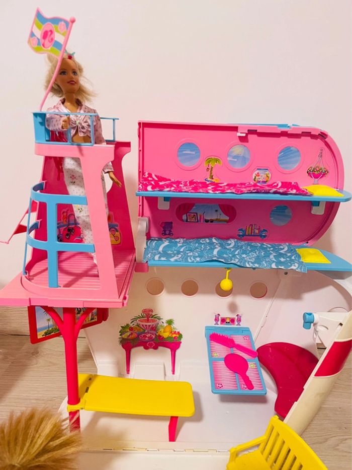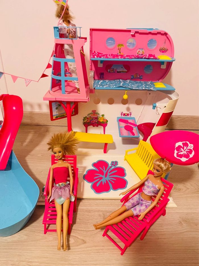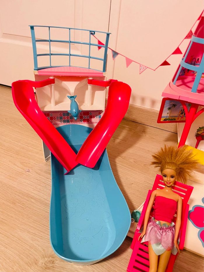 Très bon état général sauf le banc jaune abîmé, donne avec trois Barbie. Le bateau est fermé avec tous les accessoires à l’intérieur. Une table (dernière photo) que j’ai oublié sur la photo #barbie #bateau #bateaupoupee #bateaubarbie #piscine #transatbarbie