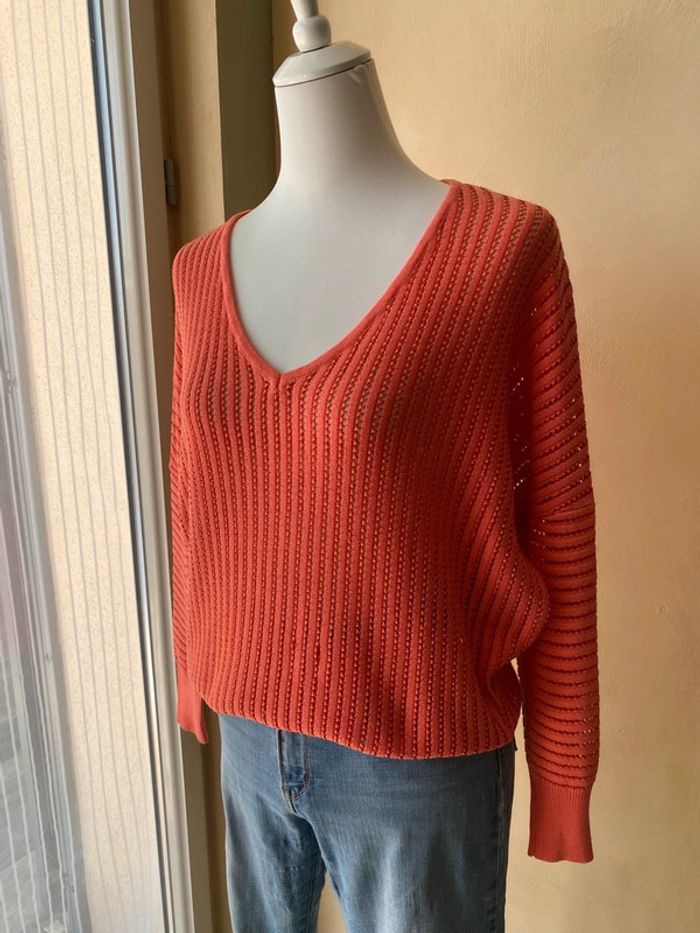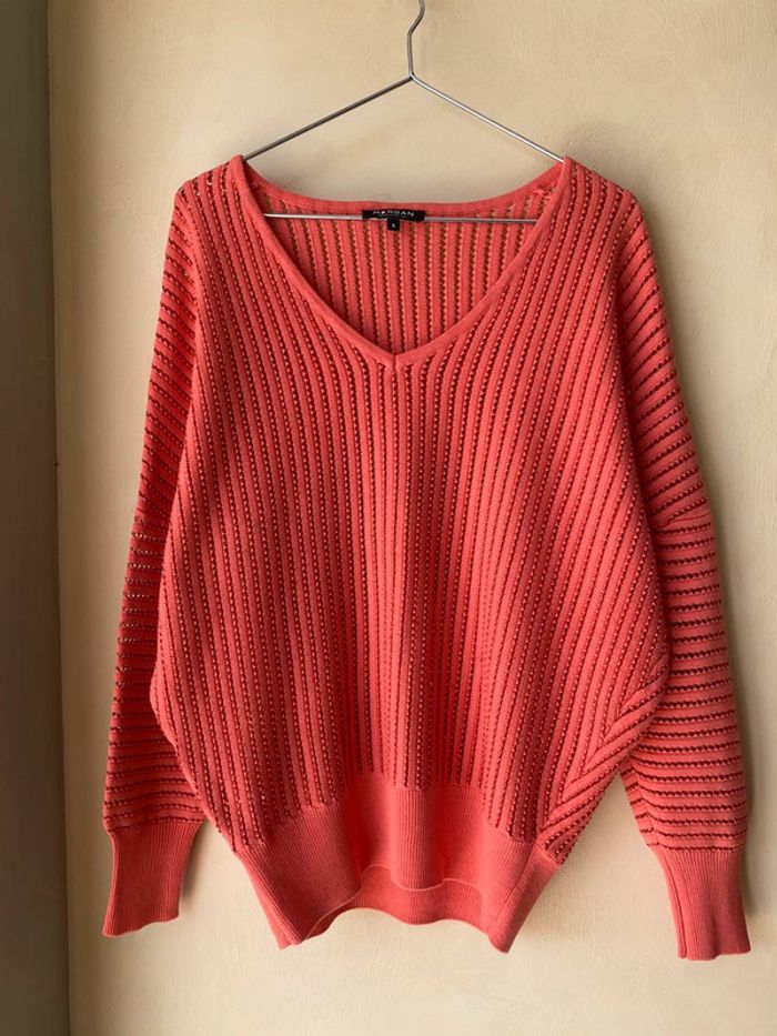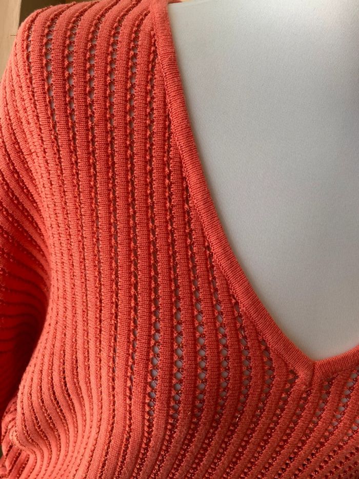 Pull V ajouré orange corail Morgan S Largeur épaules 77 Largeur poitrine 64 Largeur taille 35 Longueur manche 38 Longueur dos 63 Petit défaut voir photos