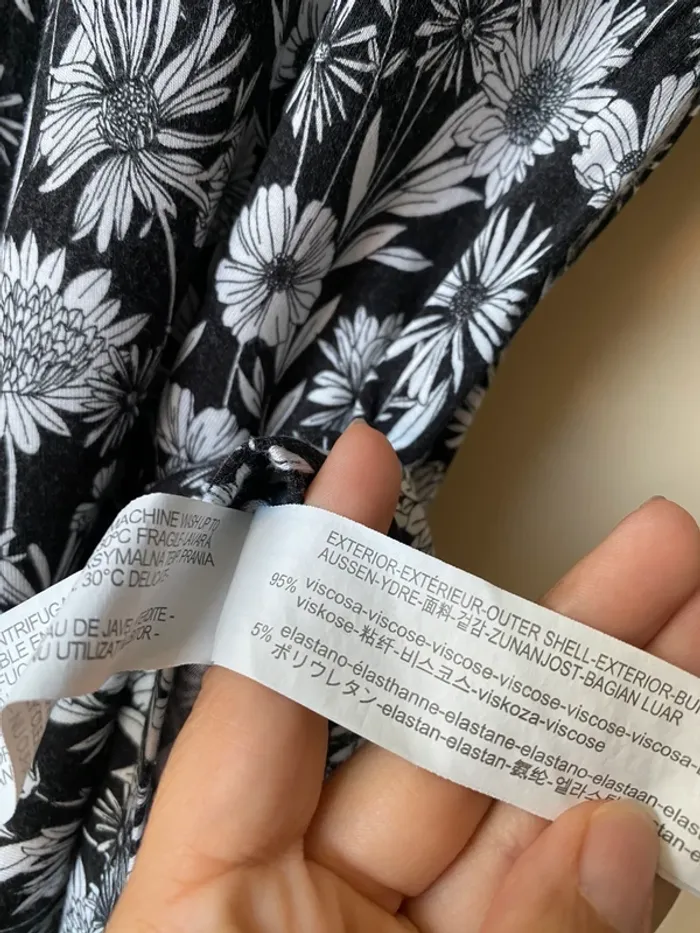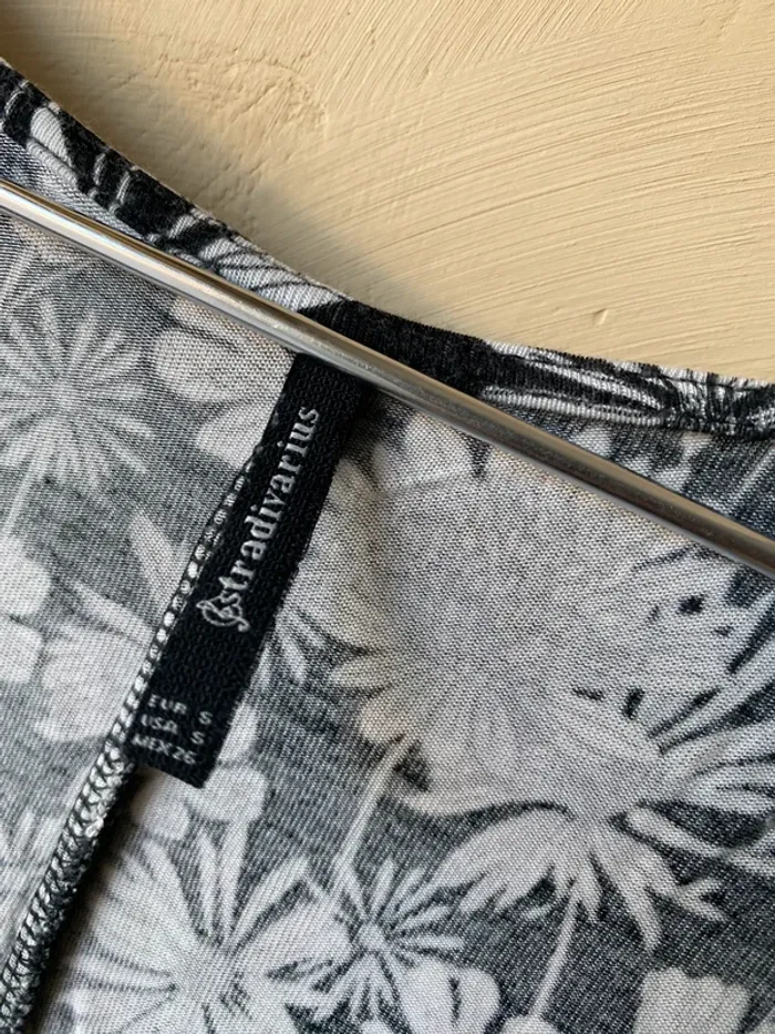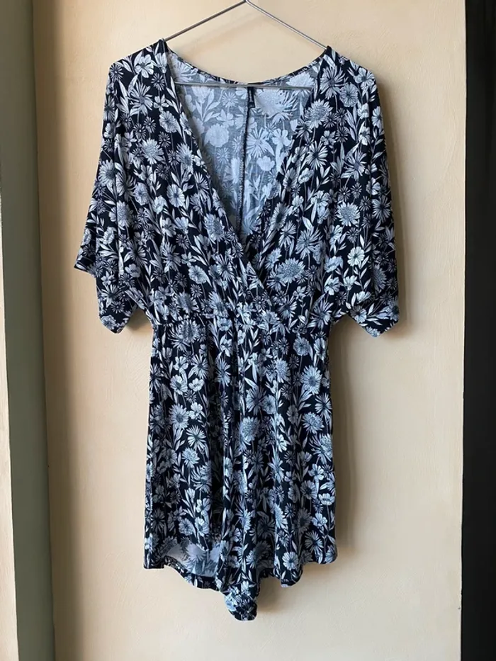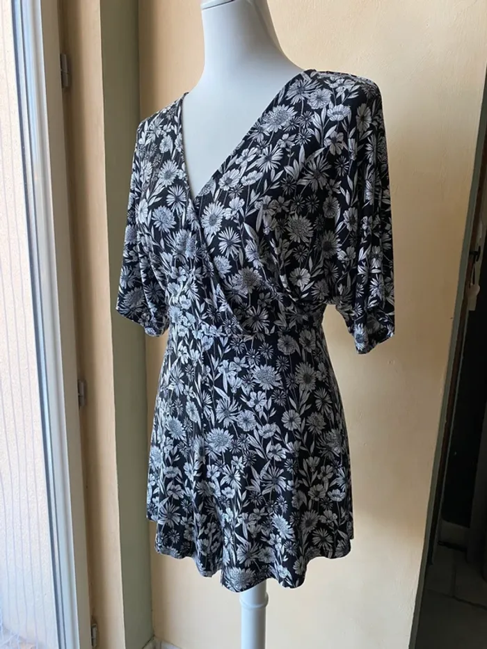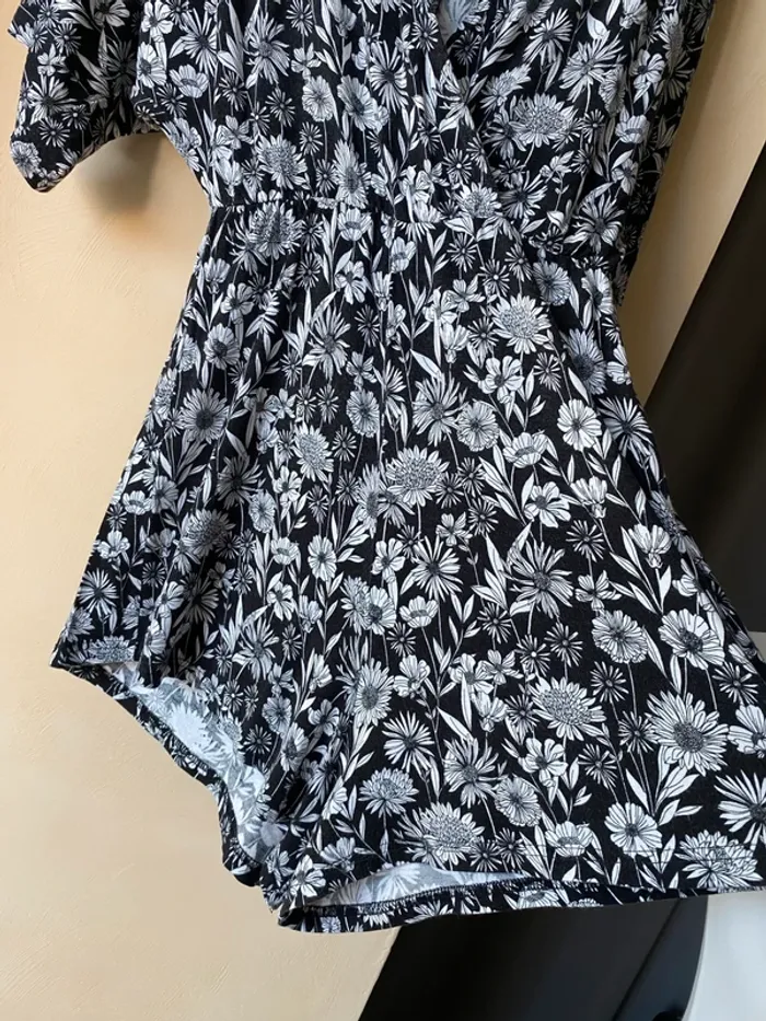 Combi short fleuri Stradivarius S Noir et blanc Fluide et confortable Encolure V croisé Manches 1/2 Taille élastique haute Largeur taille 30 Envergure 93 Longueur 79