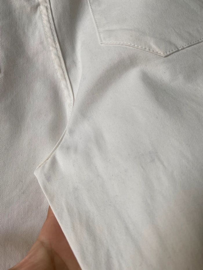 Jean blanc court Kiabi 40 Slim fit Fermeture boutons Largeur taille 40 Largeur hanche 47,5 Hauteur taille 22,5 Longueur totale 89 Longueur jambe 63 Largeur cuisse 27 Largeur cheville 15,5 Très très légère trace à une fesse
