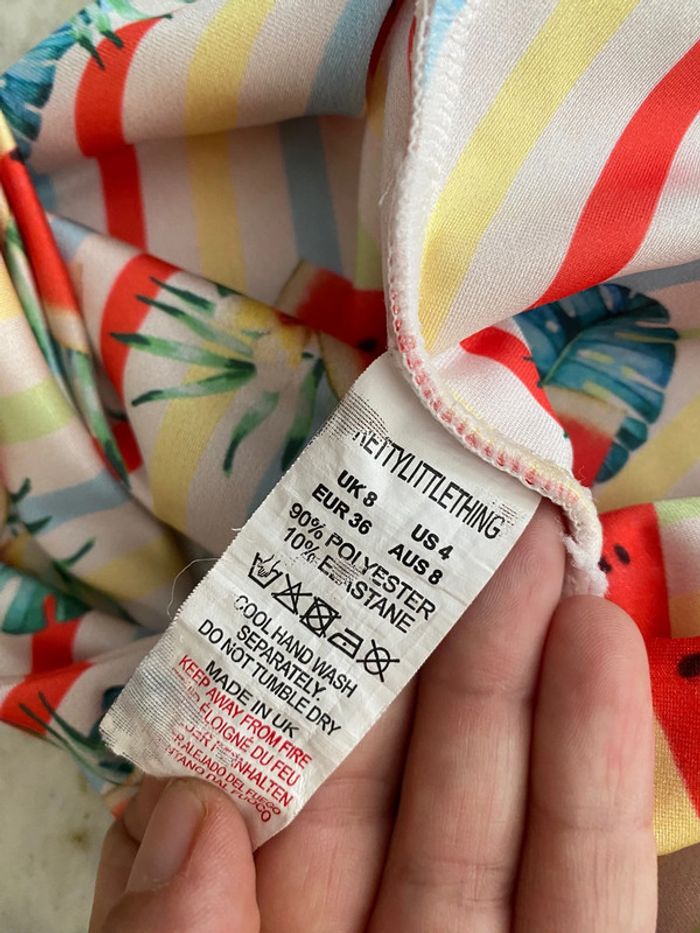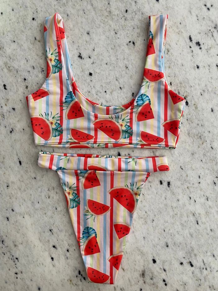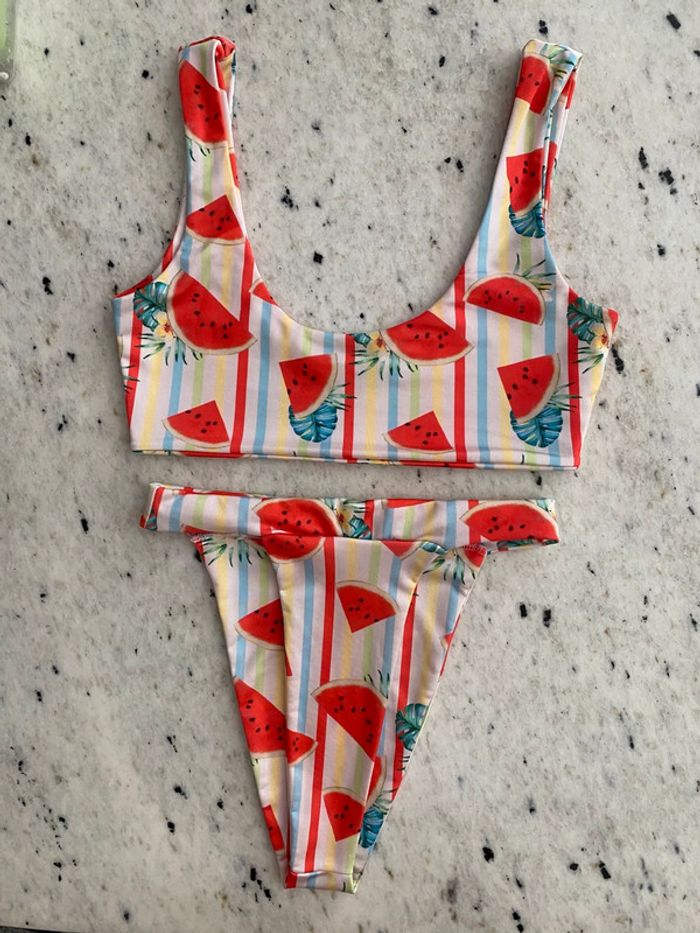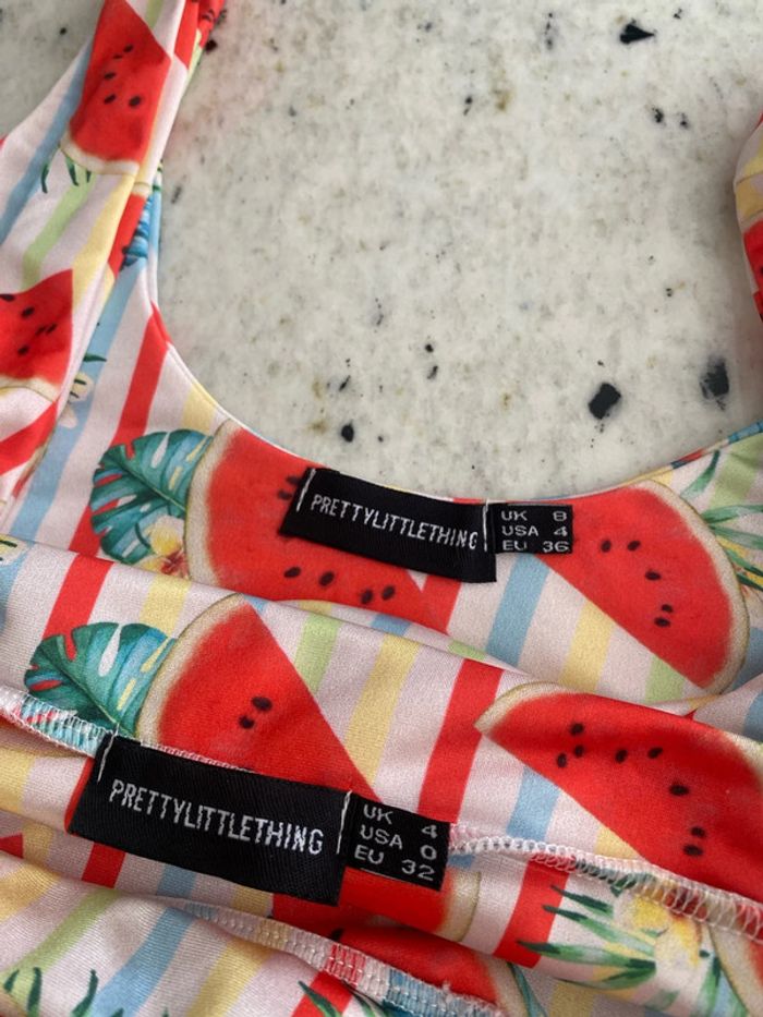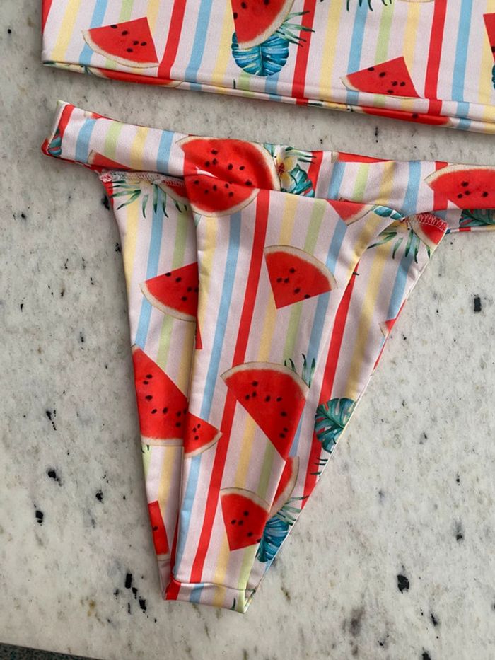 Maillot de bain 2 pièces Prettylittlething 32/36 Motifs pastèque et rayures Haut bandeau 36 Bas brésilien taille haute 32