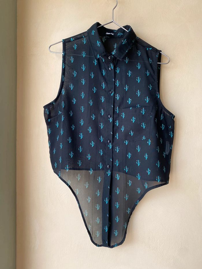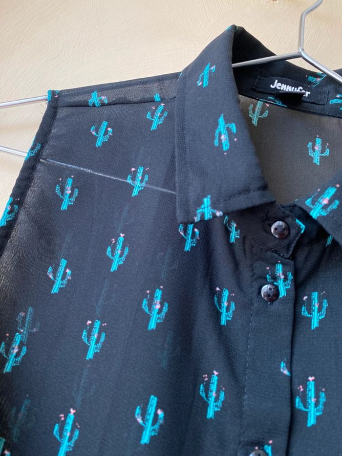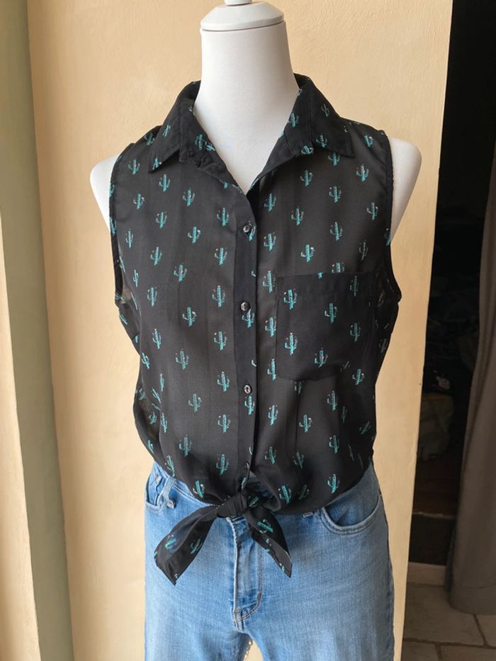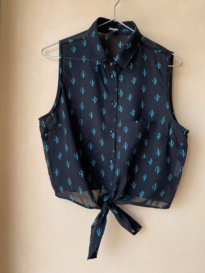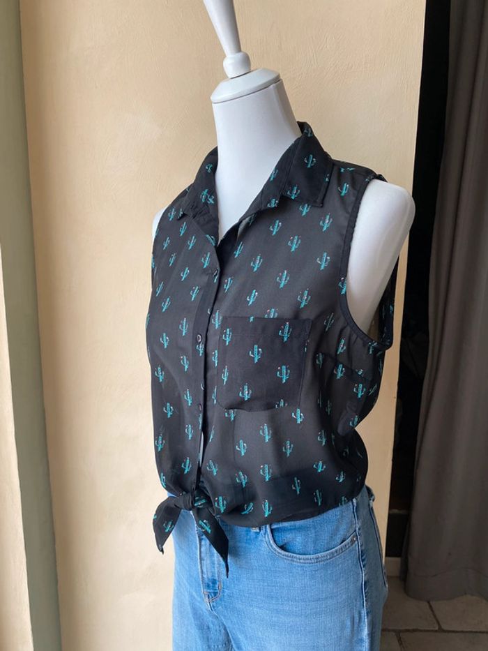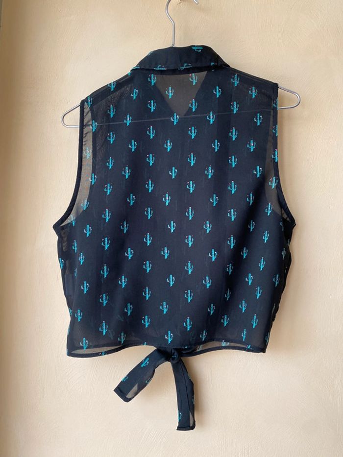 Chemise sans manches noir motifs cactus verts À nouer en bas Jennyfer M Transparence Largeur épaules 32 Largeur poitrine 48 Longueur dos 44