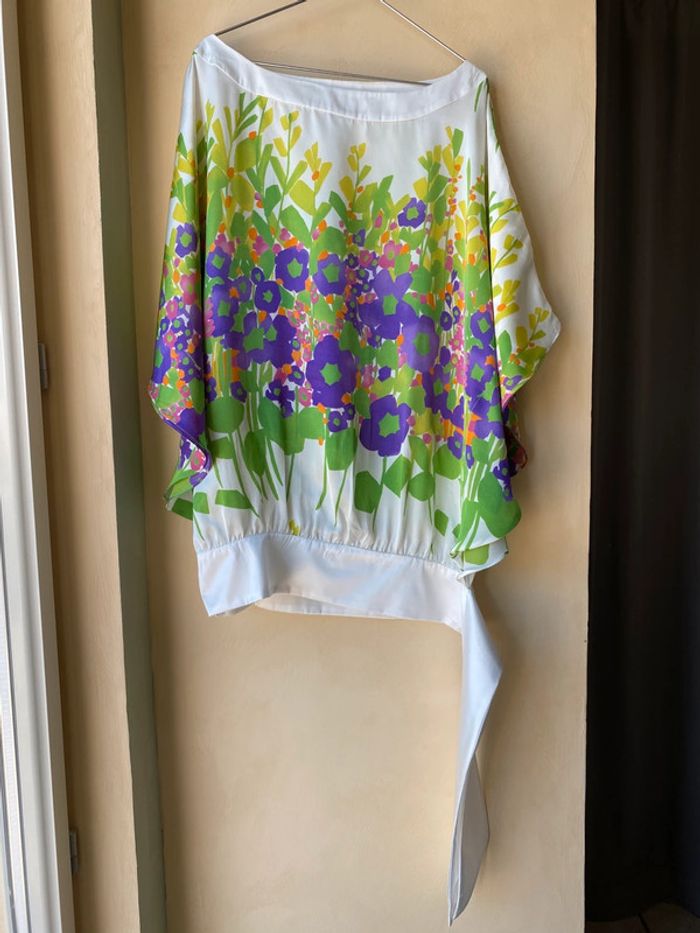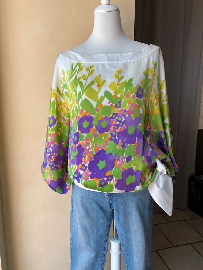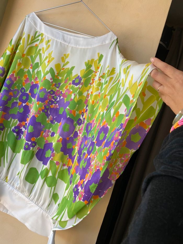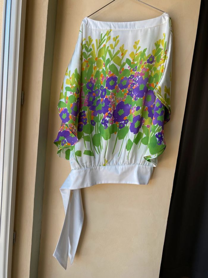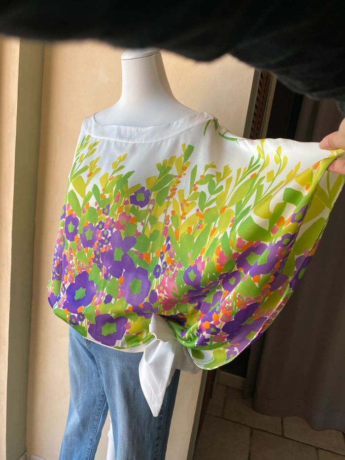 Blouse fleurie en satin fluide Zara M Largeur ruban à nouer à la taille Coupe papillon Envergure 108 Largeur taille 45 Longueur dos 77