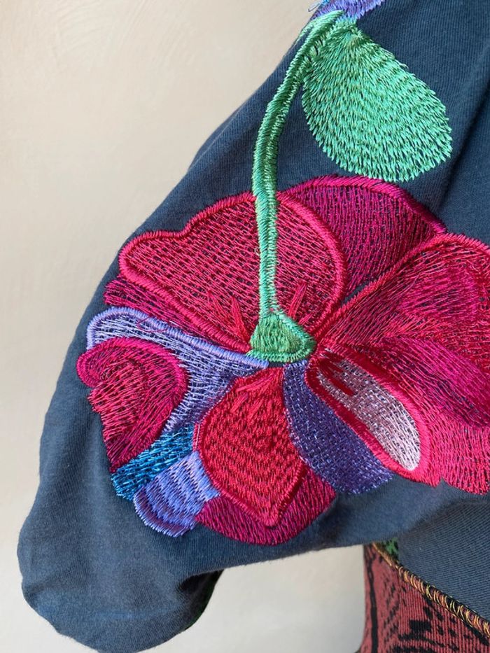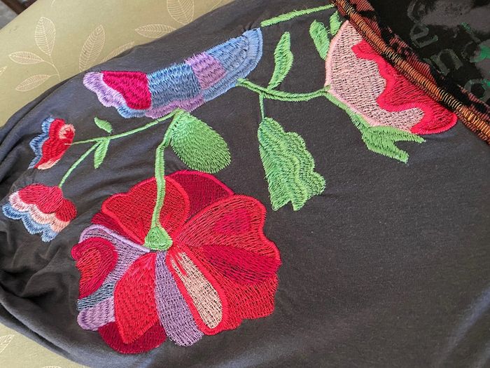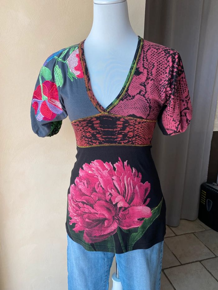Top Desigual S Manches courtes bouffantes brodées Encolure V Motifs fleurs pivoines et imprimé animal Envergure 78 Largeur taille 34 Longueur dos 67