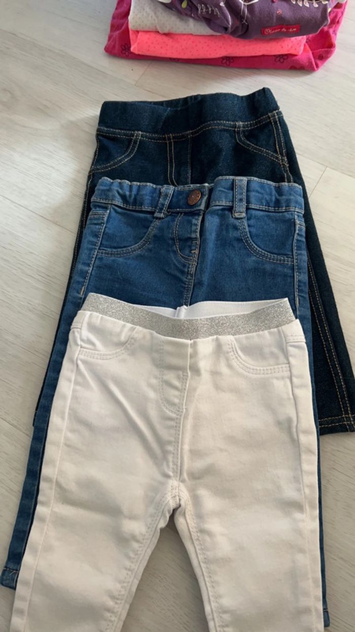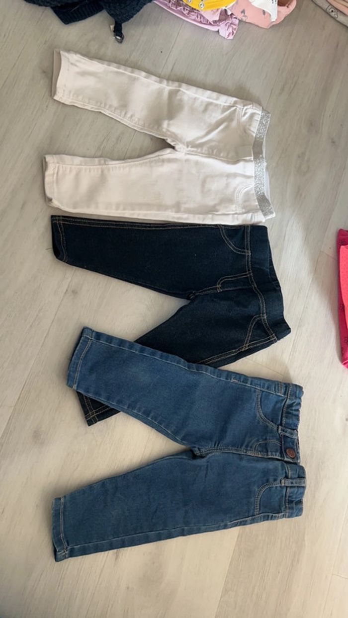 Un jean kiabi, un jegging bleu foncé, un pantalon blanc TAO 9 mois