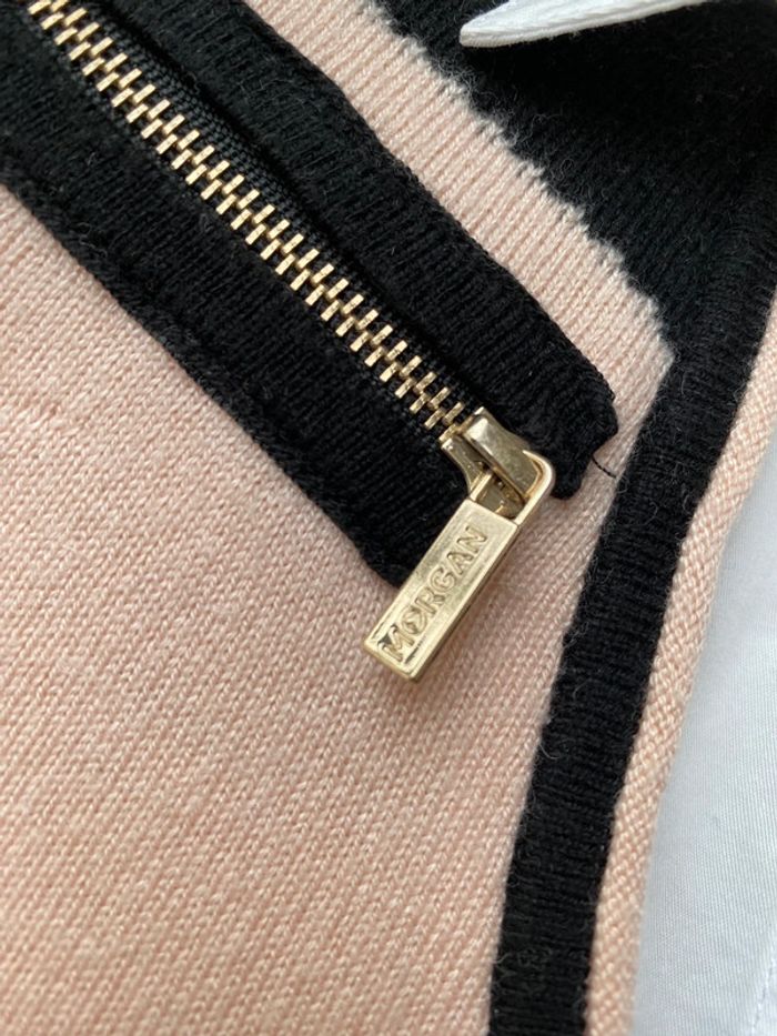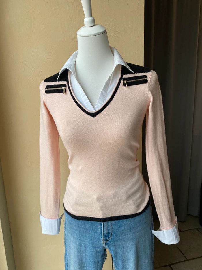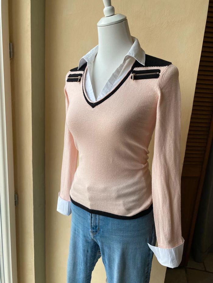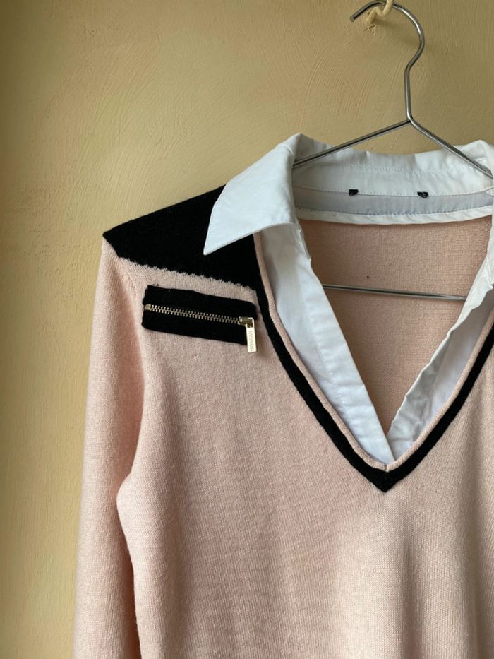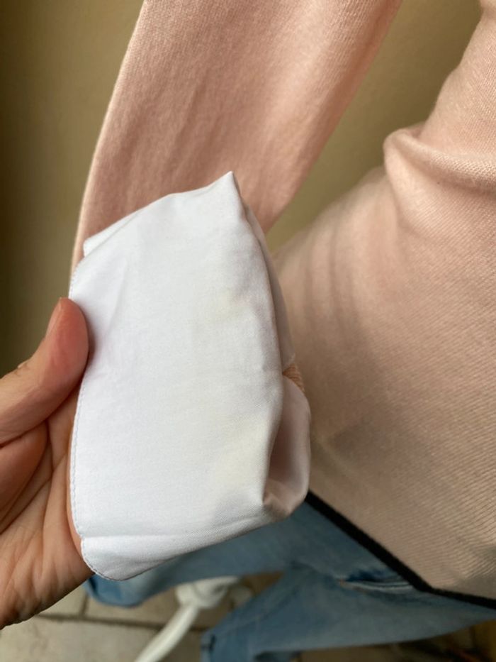 Pull rose poudré Morgan S Col et bouts de manches chemise Encolure V Largeur épaules 33,5 Largeur poitrine 39 Longueur manche 60 + 8 Longueur dos 57 Très Légères traces sur le blanc voir photos