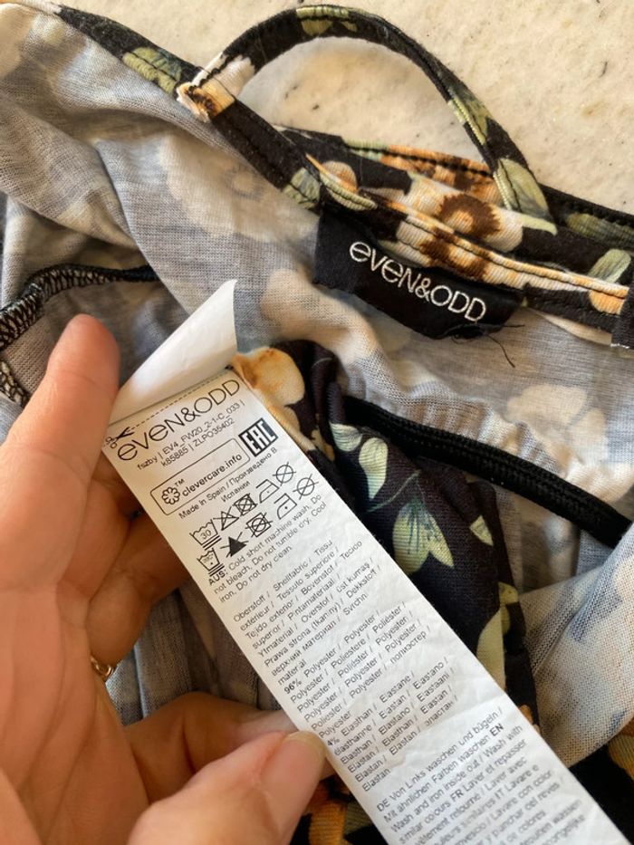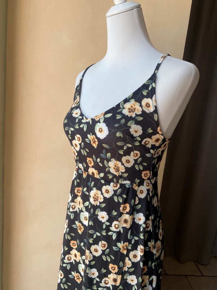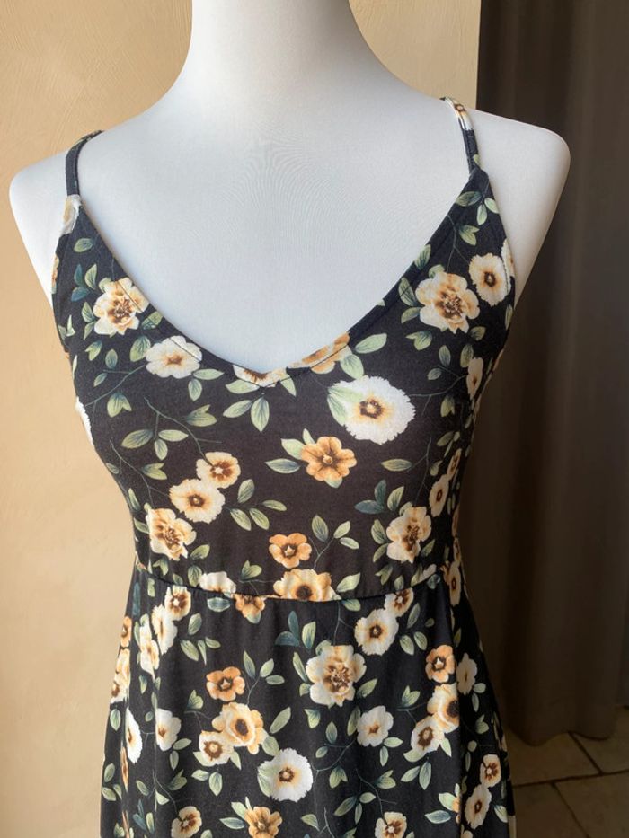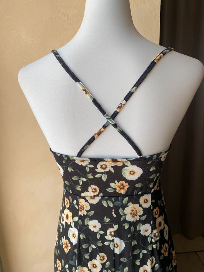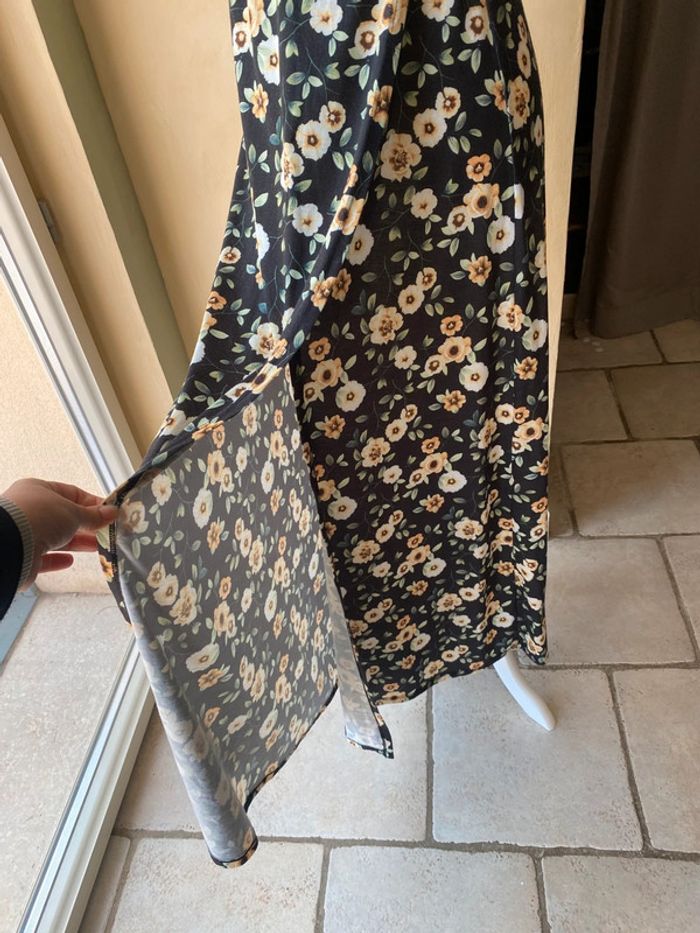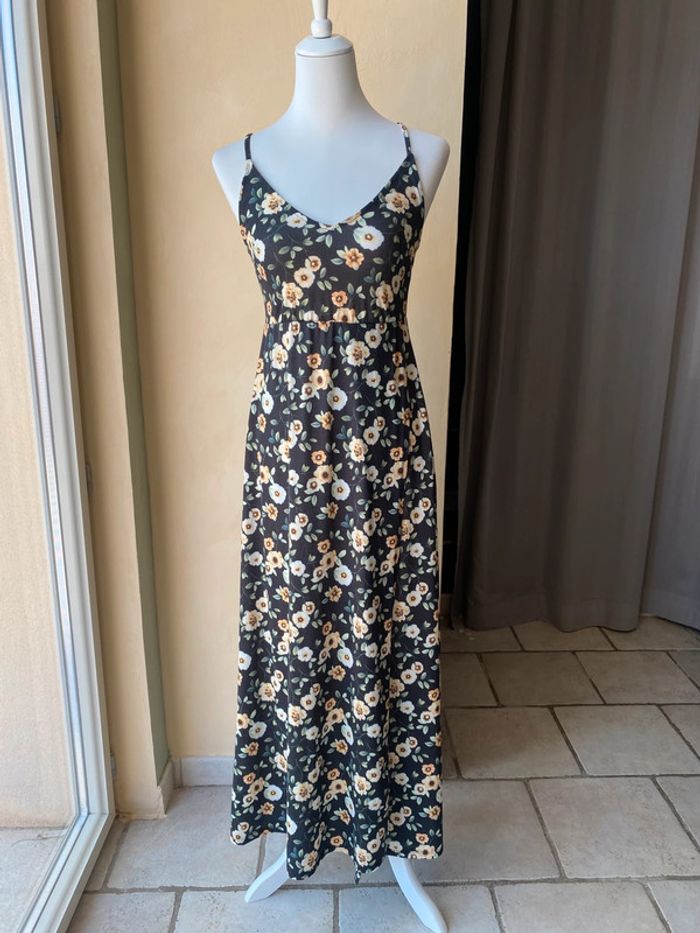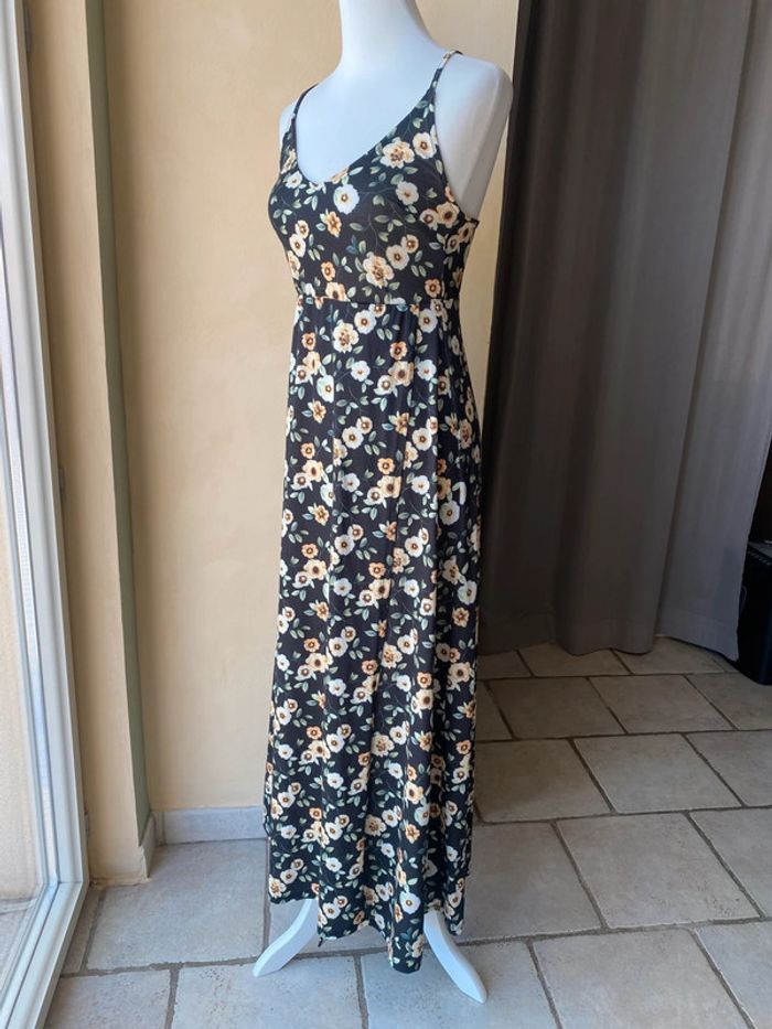 Robe longue fleurie Even&odd S Encolure V sans manches bretelles spaghettis croisé au dos Jupe longue fendue portefeuille Largeur poitrine 36 Largeur taille 32 (élastique) Longueur jupe 103 Longueur totale ≈ 135