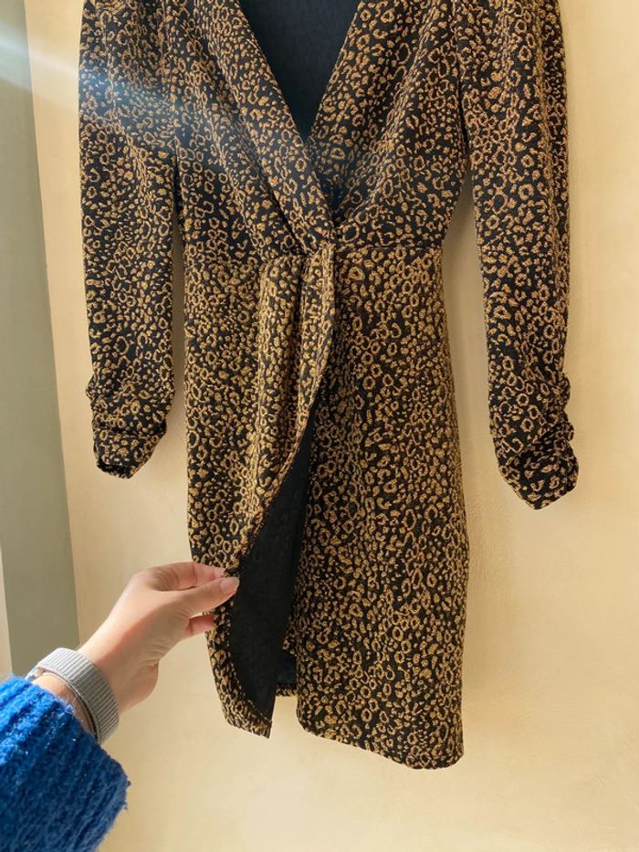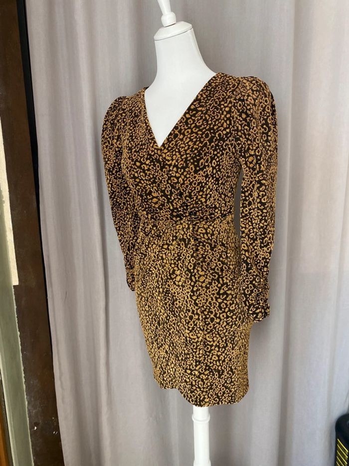 Robe de soirée noire et dorée Zara S Encolure V cache cœur Manches longues épaules bouffantes Taille élastique Jupe porte-feuille Largeur épaules 31 Longueur manche 55 Largeur taille 33 Longueur 81,5
