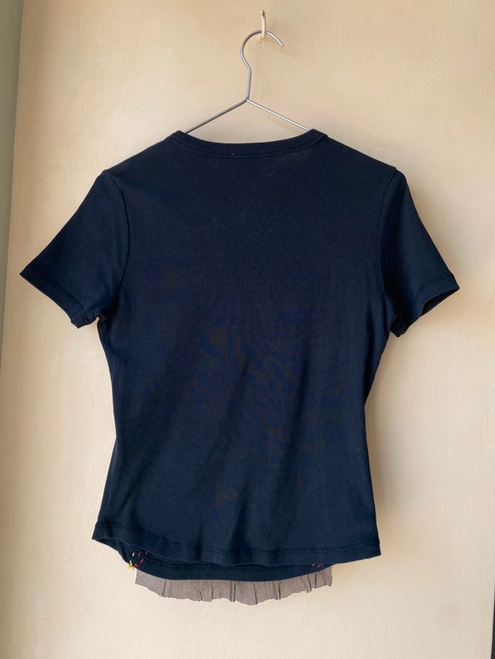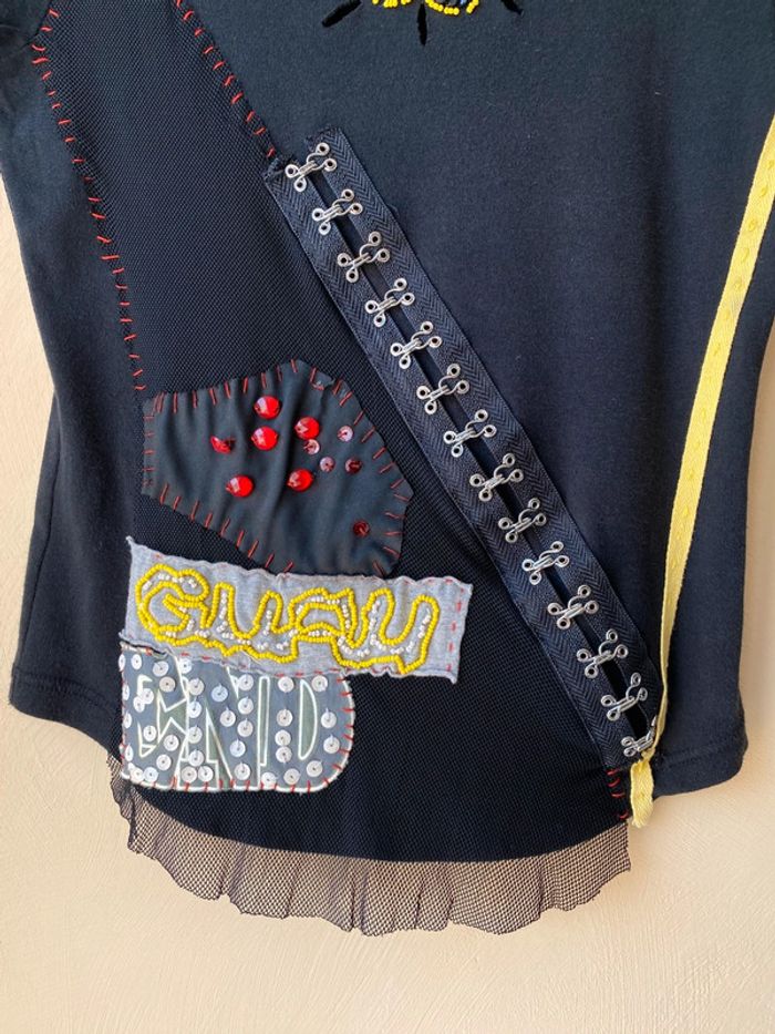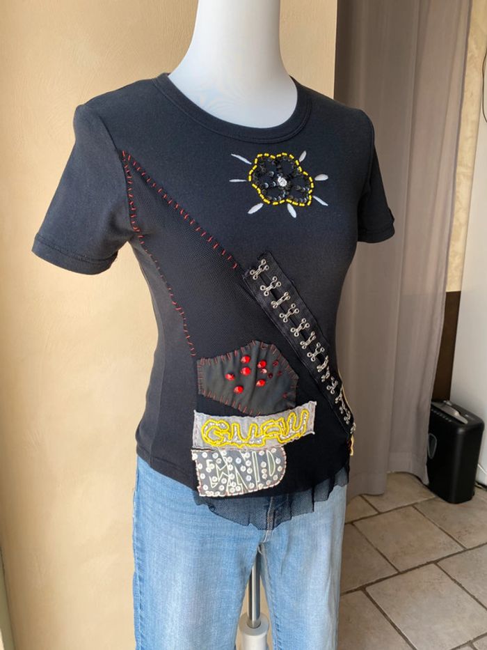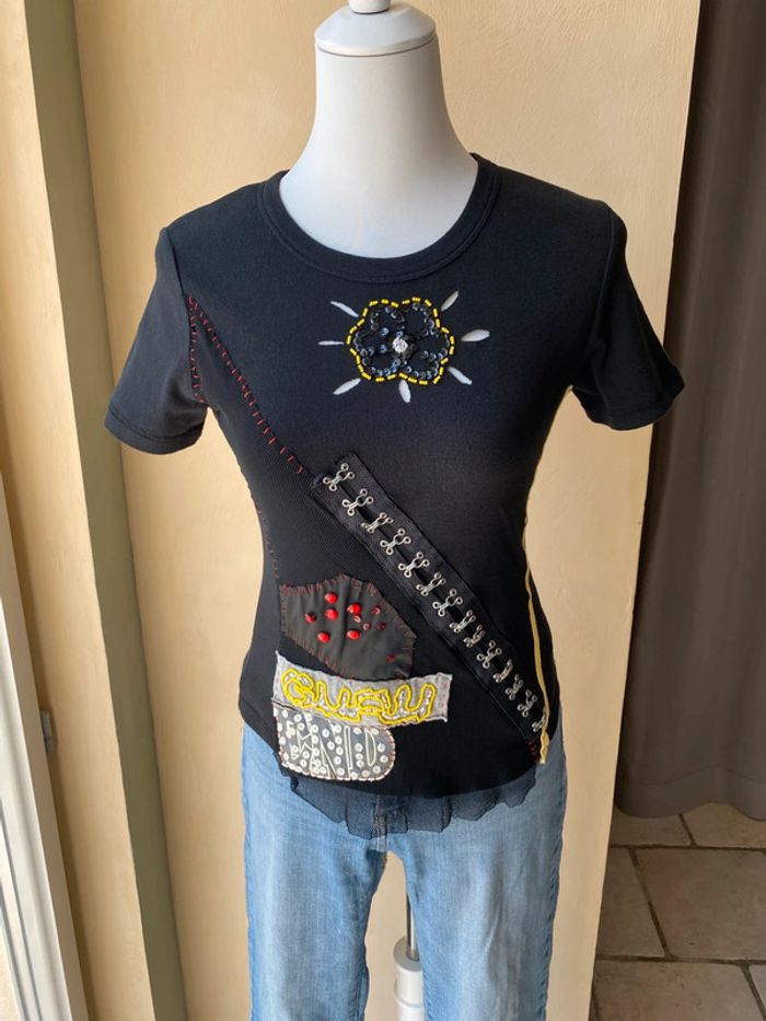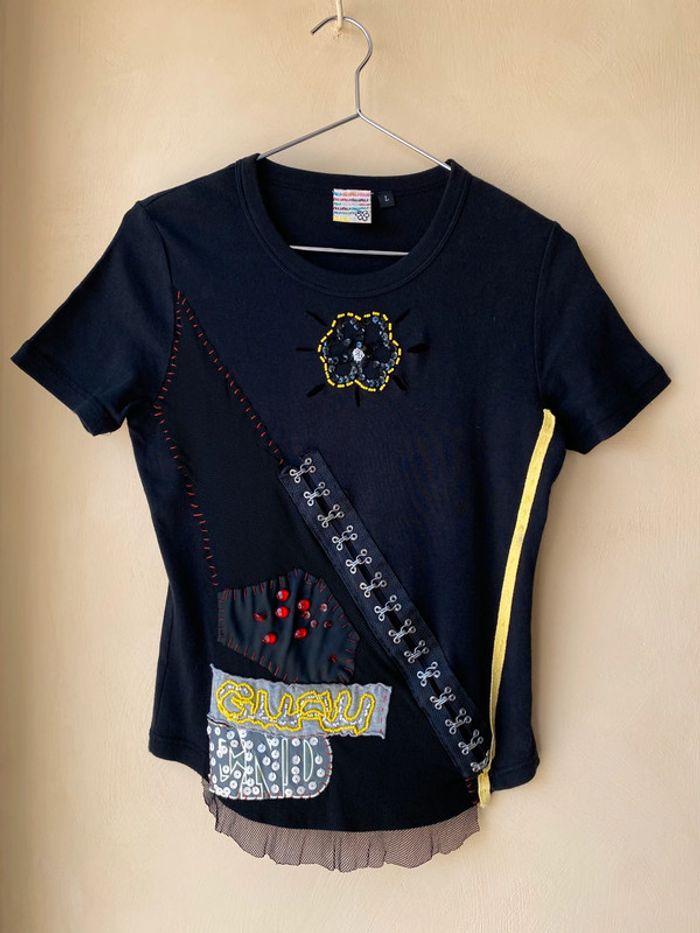 T-shirt noir fantaisie Guru L. Vintage 90’ Brodé de perles et sequins, mesh. Col rond, coupe ajustée. Largeur épaules 35 Largeur poitrine 40 Longueur dos 52