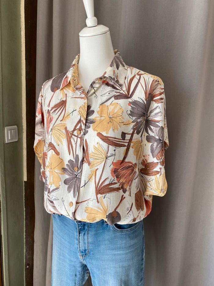 Chemisette à motifs fleurs vintage 42 Tissu effet froissé crépon Envergure 73 Largeur poitrine 61 Longueur dos 72
