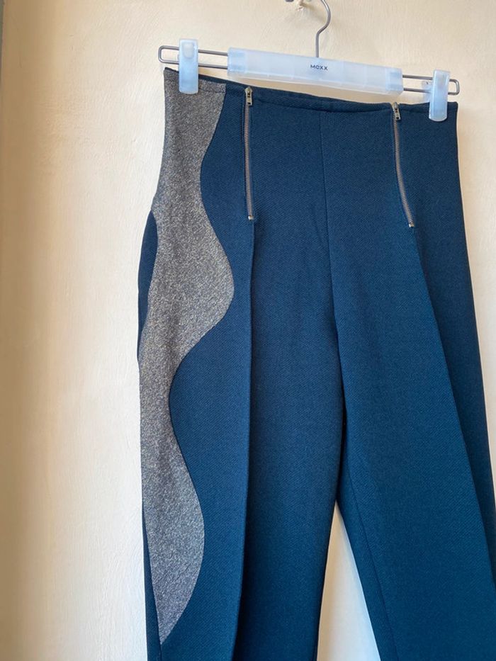Pantalon fuseau à pince noir, taille haute, motif vague lurex doré sur un côté. Fabriqué en France Largeur taille 33 Largeur hanche 44 Longueur totale 90 (avec pied) Longueur jambe 65 (avec pied)