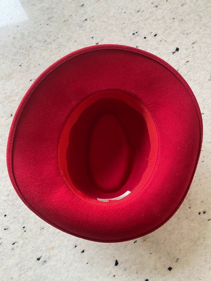 Chapeau en feutre rouge made in France. Hauteur 12cm. Largeur 31 Longueur 32,5
