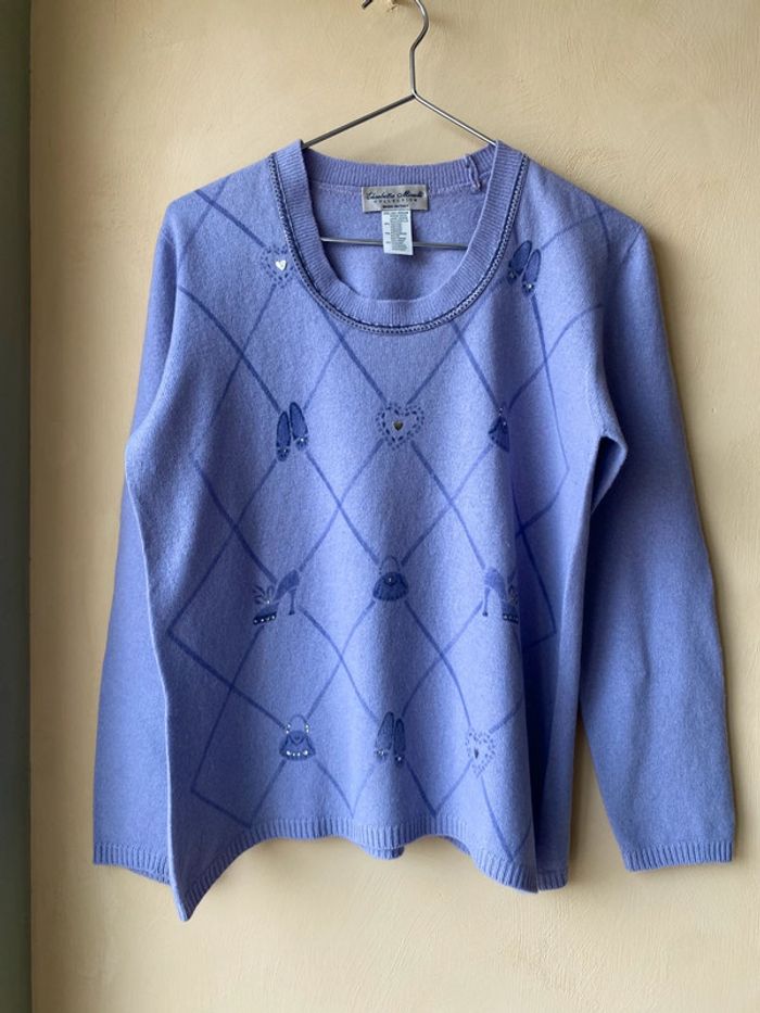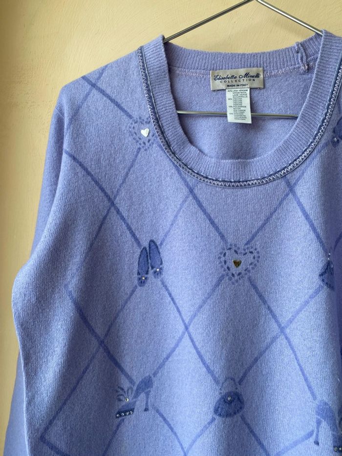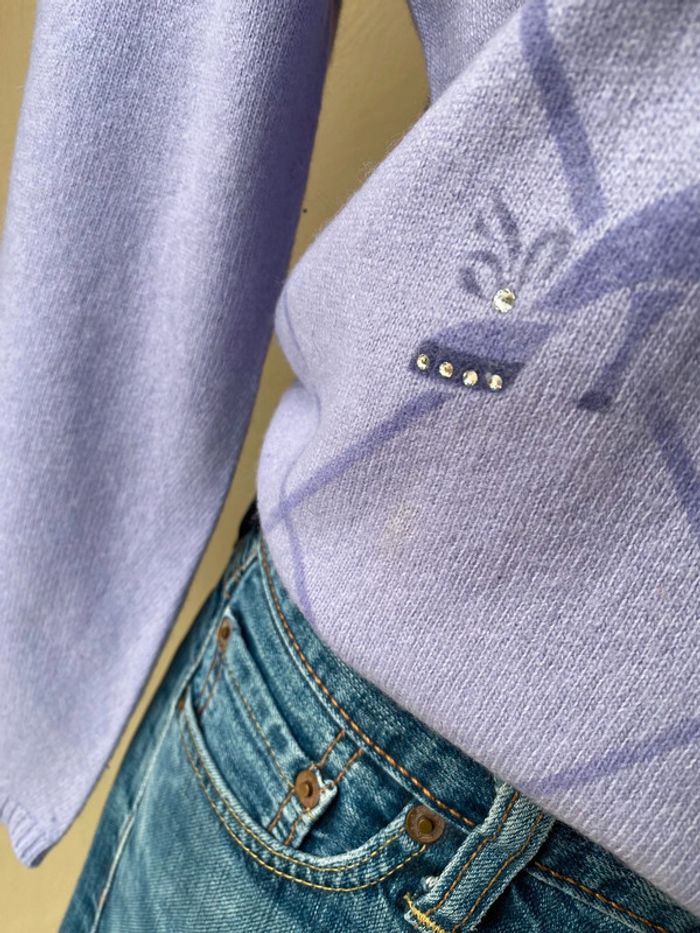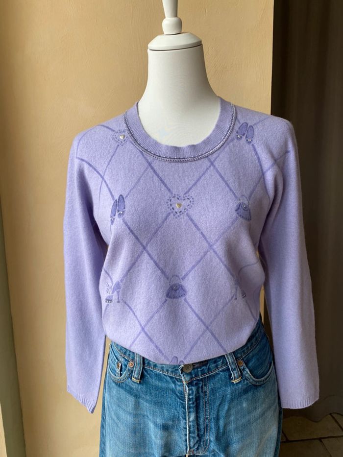 Pull violet motifs jacquard et fantaisie avec strass. Col rond bordure ruban velours. Elisabetta Minelli. Made in Italy. 2 très légère traces voir photos Largeur épaules 38 Largeur poitrine 47 Longueur dos 54