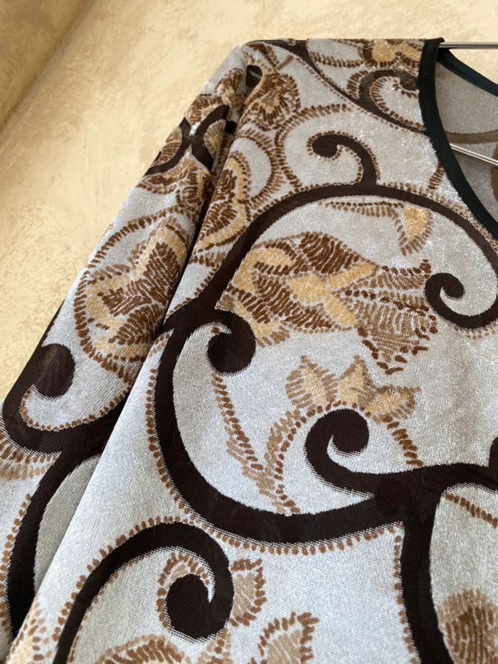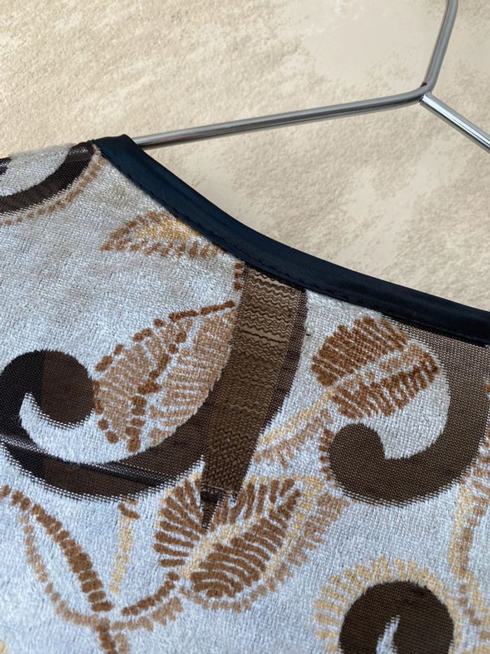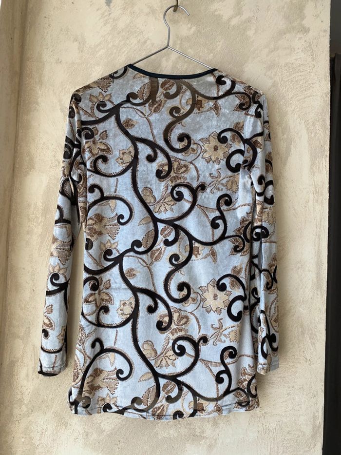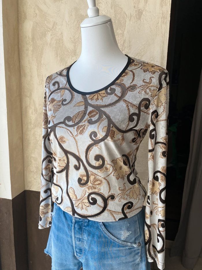 Top manches longues velours vintage S/M Motifs arabesques Velour et mesh Manches légèrement évasées Largeur épaules 36 Largeur poitrine 45 Longueur manche 55,5 Longueur dos 69 Échelle dans le dos au cou