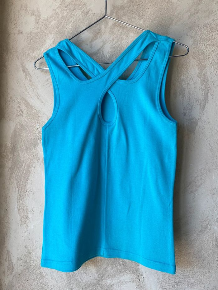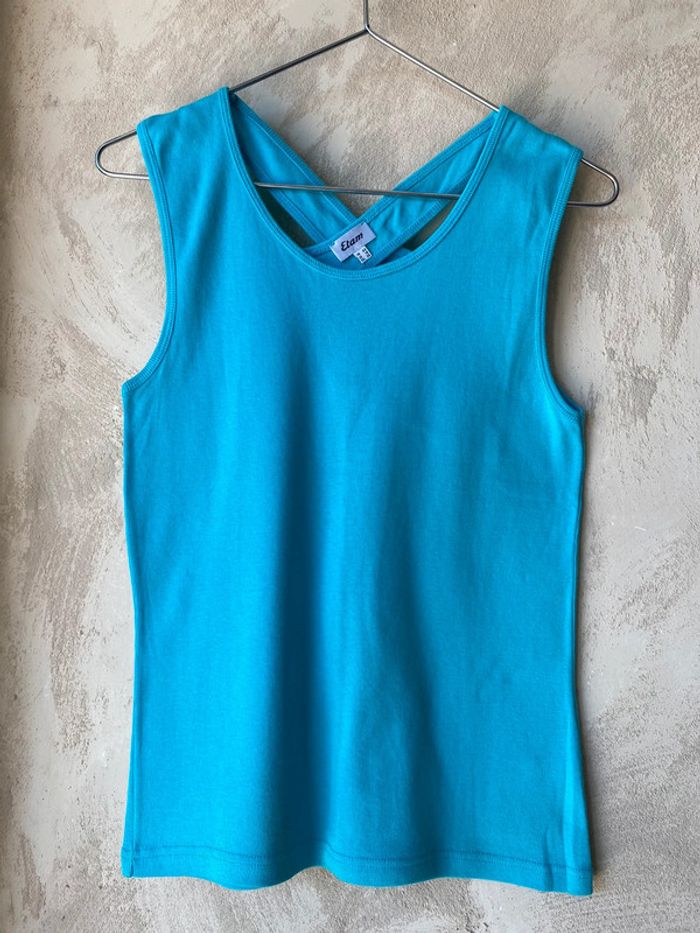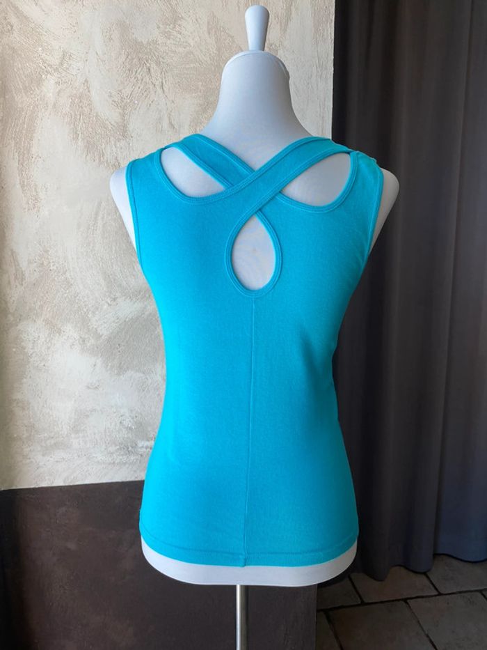 Débardeur turquoise ajouré au dos. Jolie découpe au dos Largeur poitrine 37 Longueur dos 57 Comme neuf
