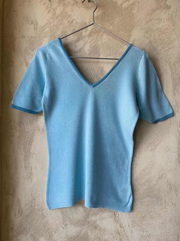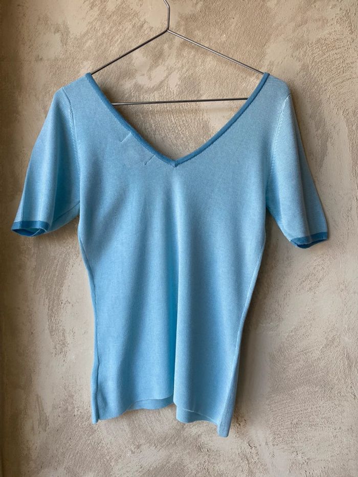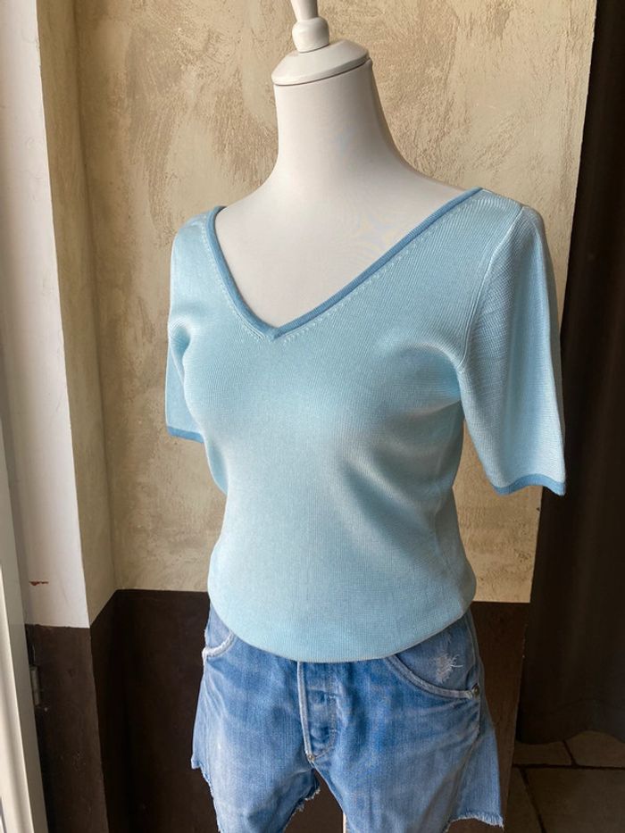 Top manches courtes en mailles satinées bleu ciel, encolure V devant et au dos. #123vintage #dosenv Largeur poitrine 39 Longueur 58