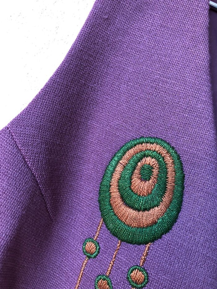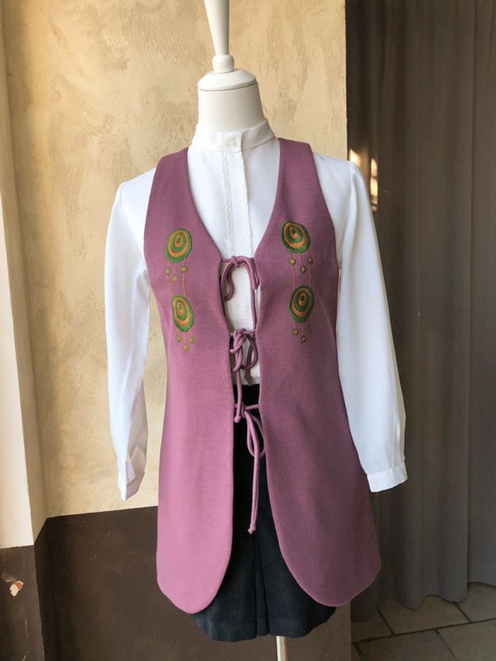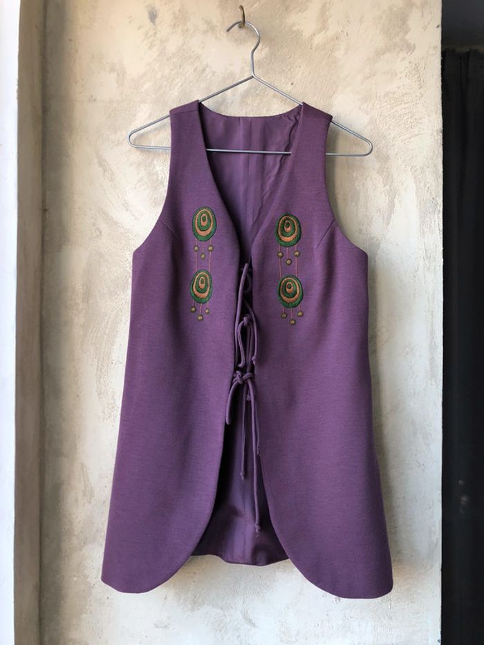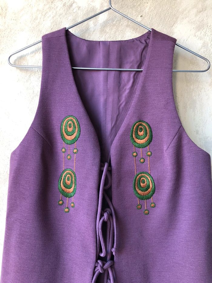 Veste sans manches brodées 70’ Violet/vieux rose. Un petit accroc discret. Une légère petite tâche. Largeur épaules 25 Largeur poitrine 41 Longueur dos 72,5 #vintage70s #giletsansmanchesvintage