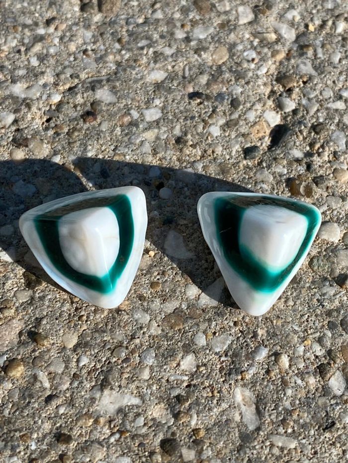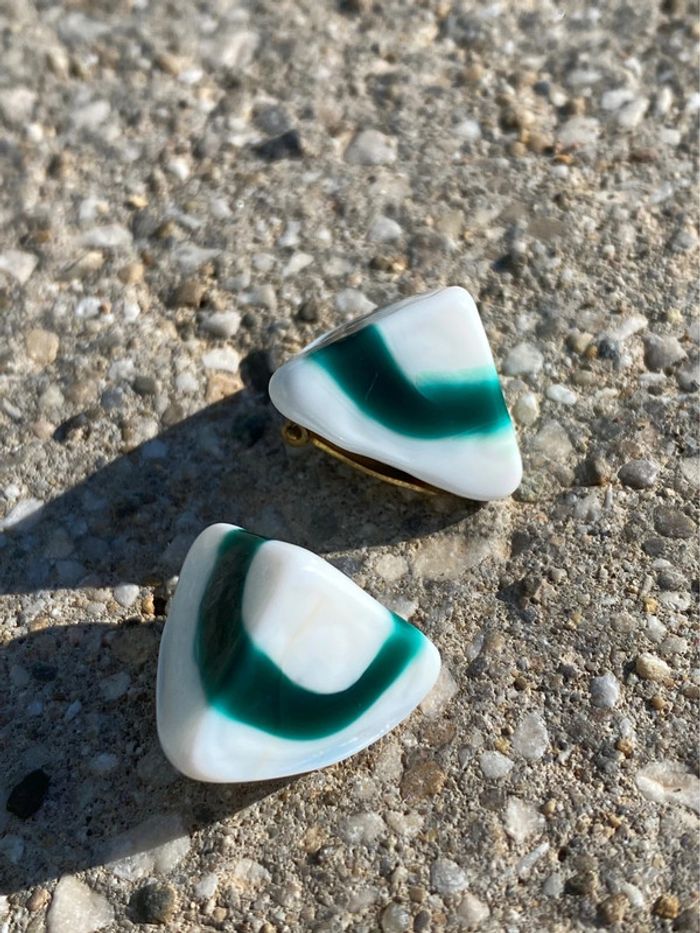 Boucles d’oreilles à pinces, forme pyramidal qui fait penser à des bonbons berlingot. En patte de verre bicolore. Vintage 70’ 2cm