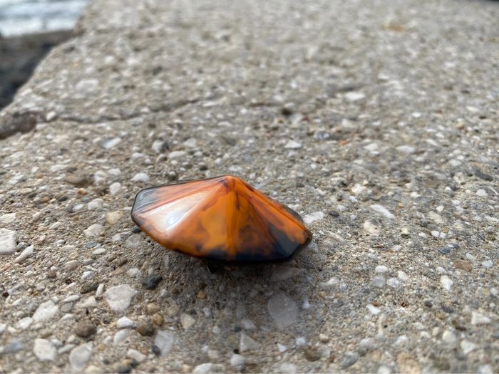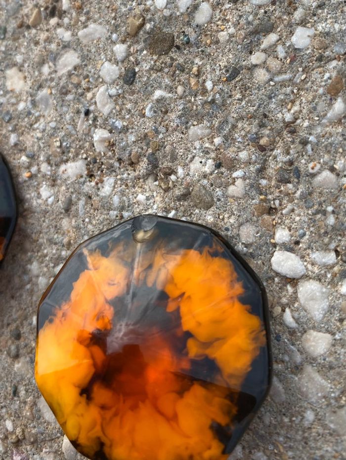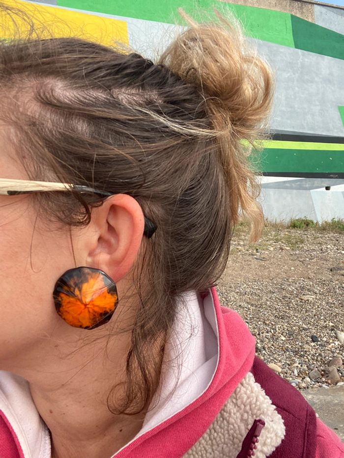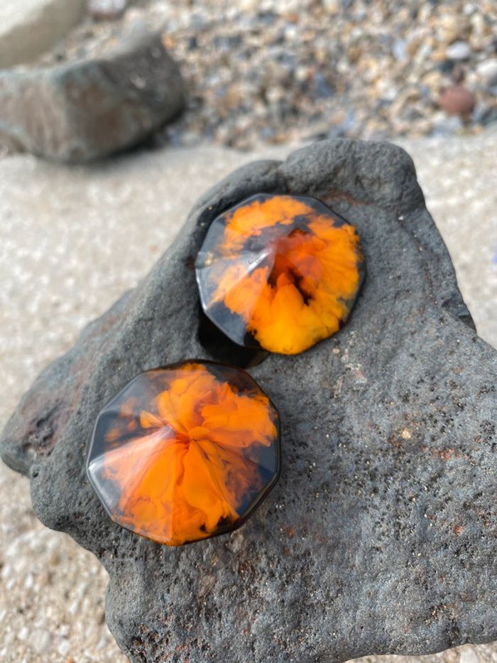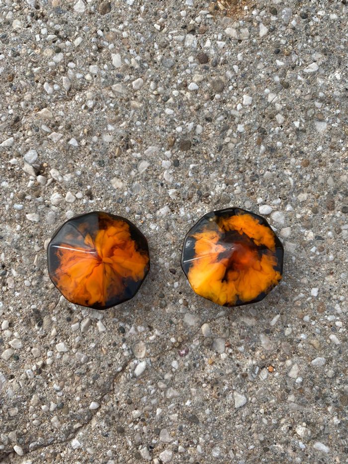 Boucles d’oreilles à pinces, en résine, orange et marron. 3,5cm de diamètre Un petit défaut discret voir photo