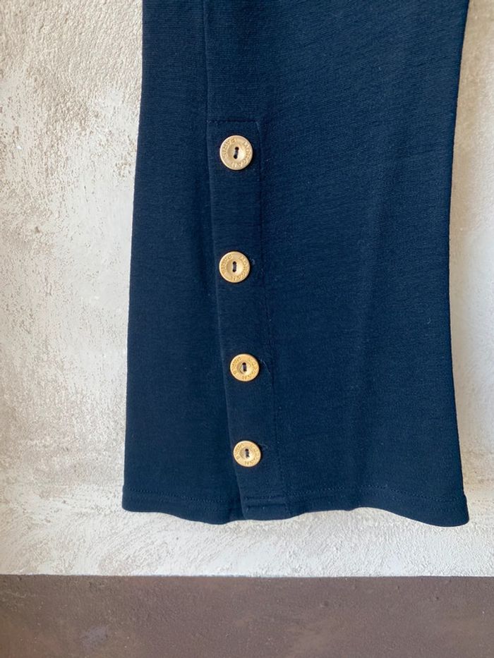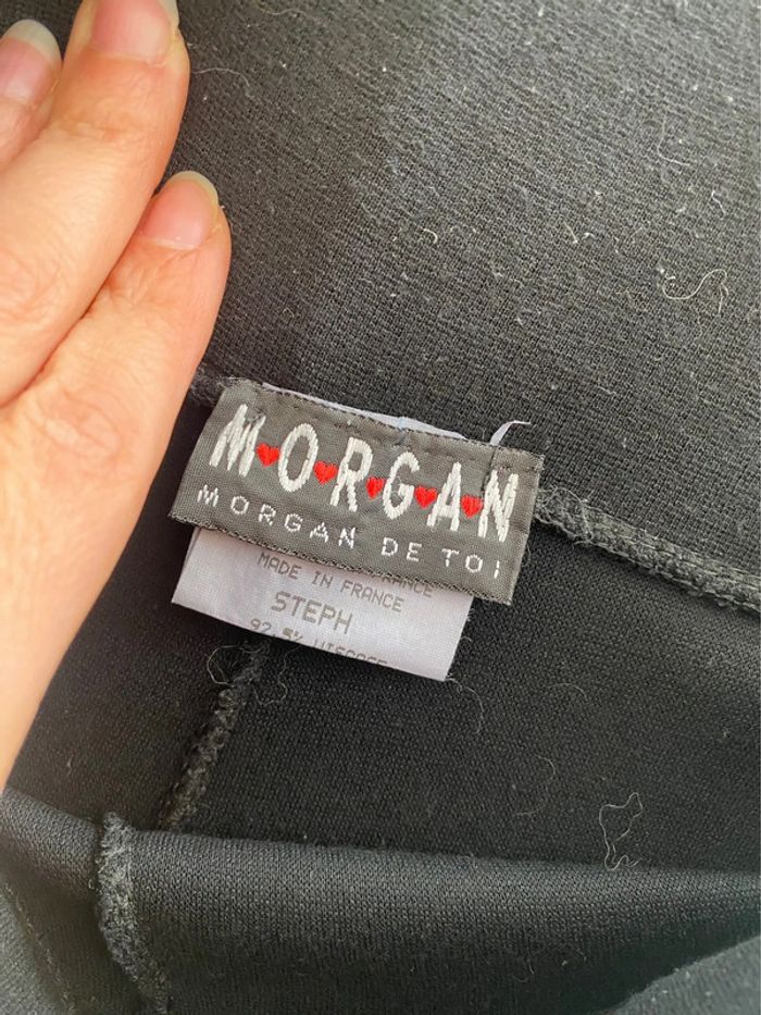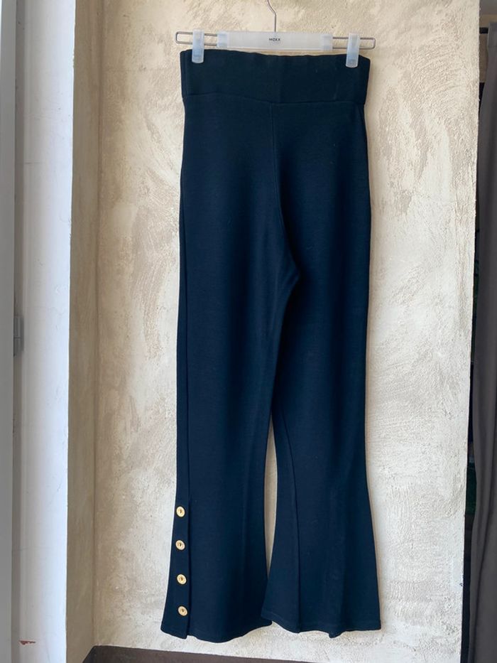 Pantalon Morgan noir évasé, taille haute, boutonné doré en bas. Made in France. Largeur taille 32 Longueur total 103 Longueur jambe 68 Hauteur taille 38,5 Largeur cuisse 22 Largeur genou 16 Largeur en bas 23