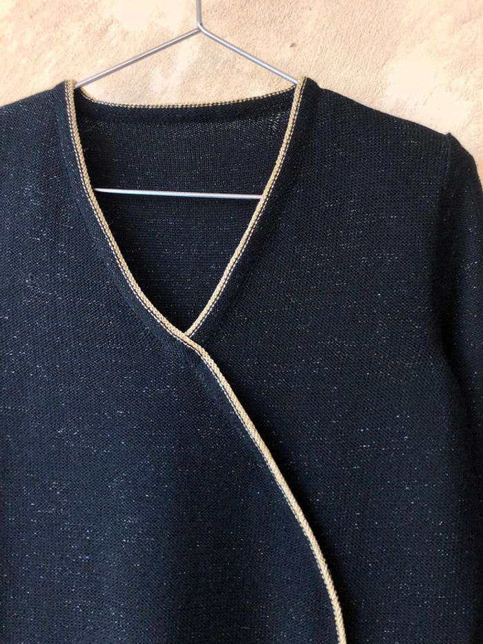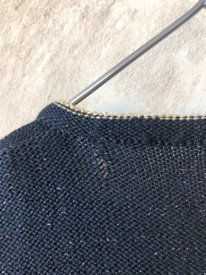 Robe en mailles noire liseré doré vintage 38/40 encolure V épaulettes largeur épaules 34 largeur poitrine 43,5 longueur manches 53 longueur dos 92 un mini accroc au dos