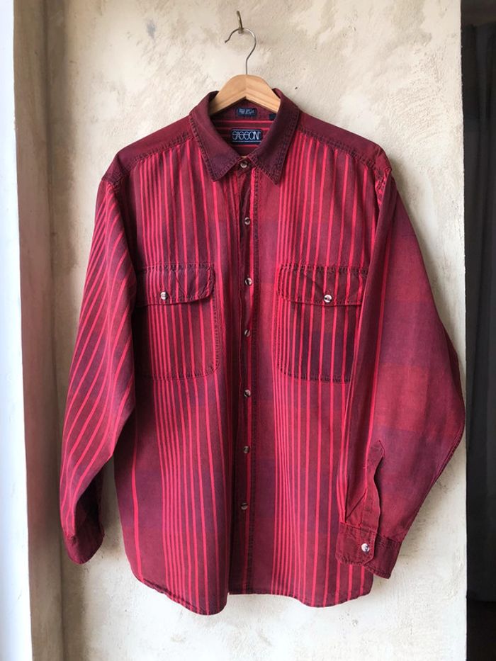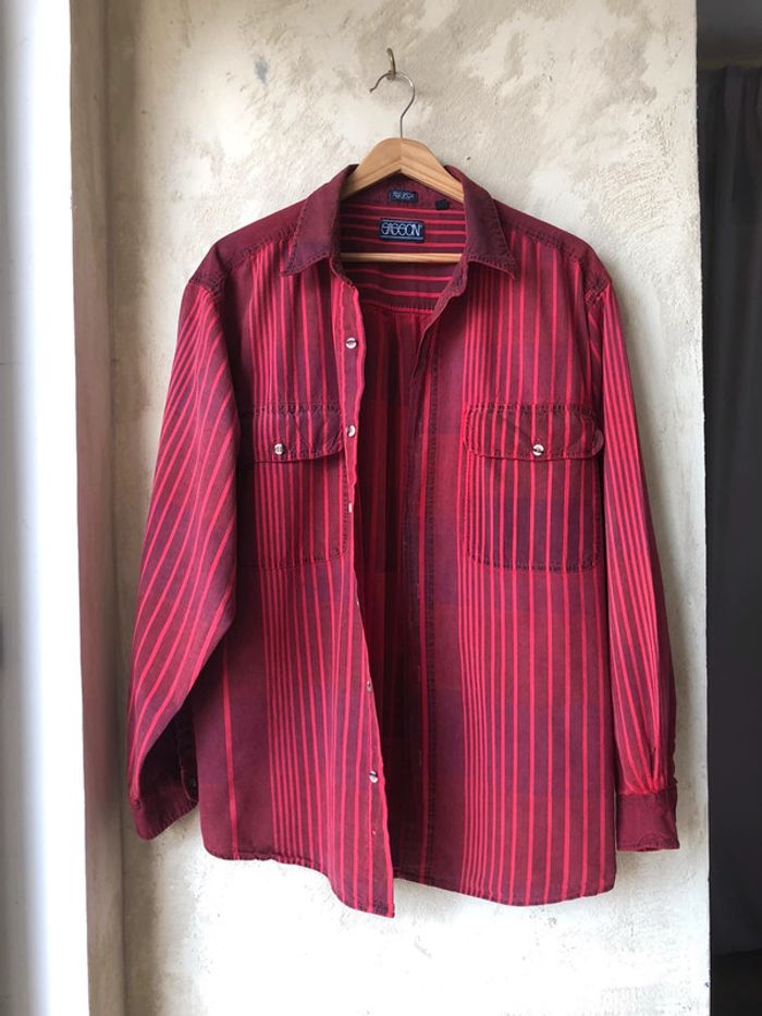 jolie Chemise en jean rayée bordeaux / rouge vintage Sasson M #chemiseoversize #chemisevintage90s largeur épaules 48,5 largeur poitrine 59 longueur manches 59 longueur dos 75 quelques légères petites tâches voir photos