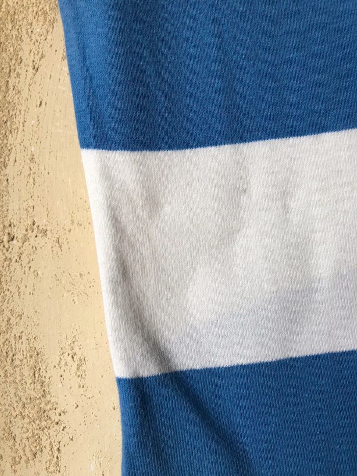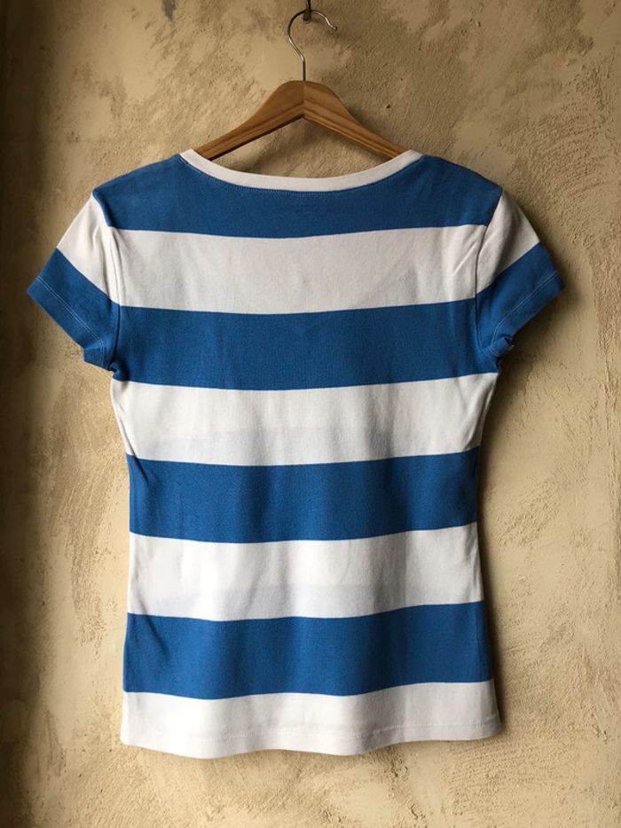 T-shirt col V, grosses rayures, coupe ajustée. Logo brodé sur la poitrine. Une mini tâche derrière sur un côté. Largeur épaules 39 Largeur poitrine 42 Largeur taille 37 Longueur 58
