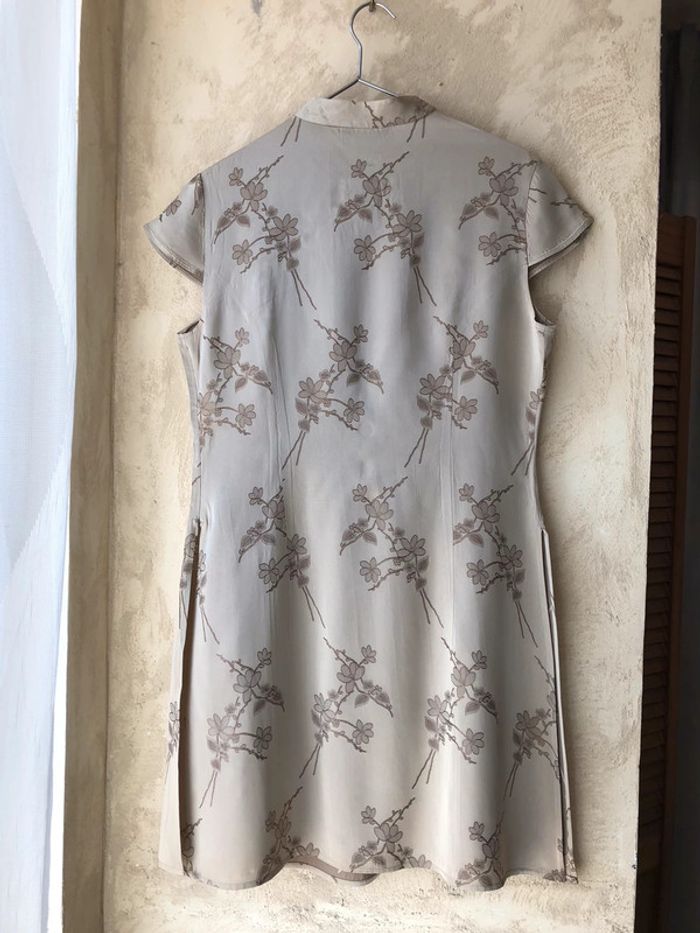 Tunique chinoise en satin Caroll 40/42 #tuniquechinoise col Mao fendue sur les côtés zip sur un côté largeur épaules 40 largeur poitrine 49 largeur taille 42 longueur 90 Une mini mini tâche