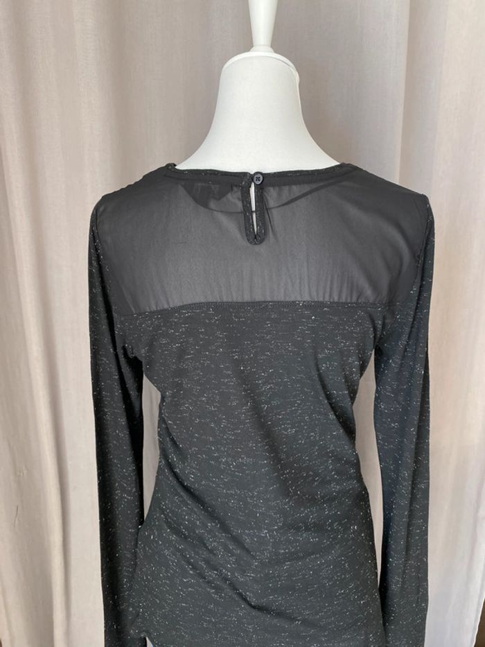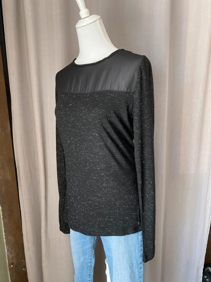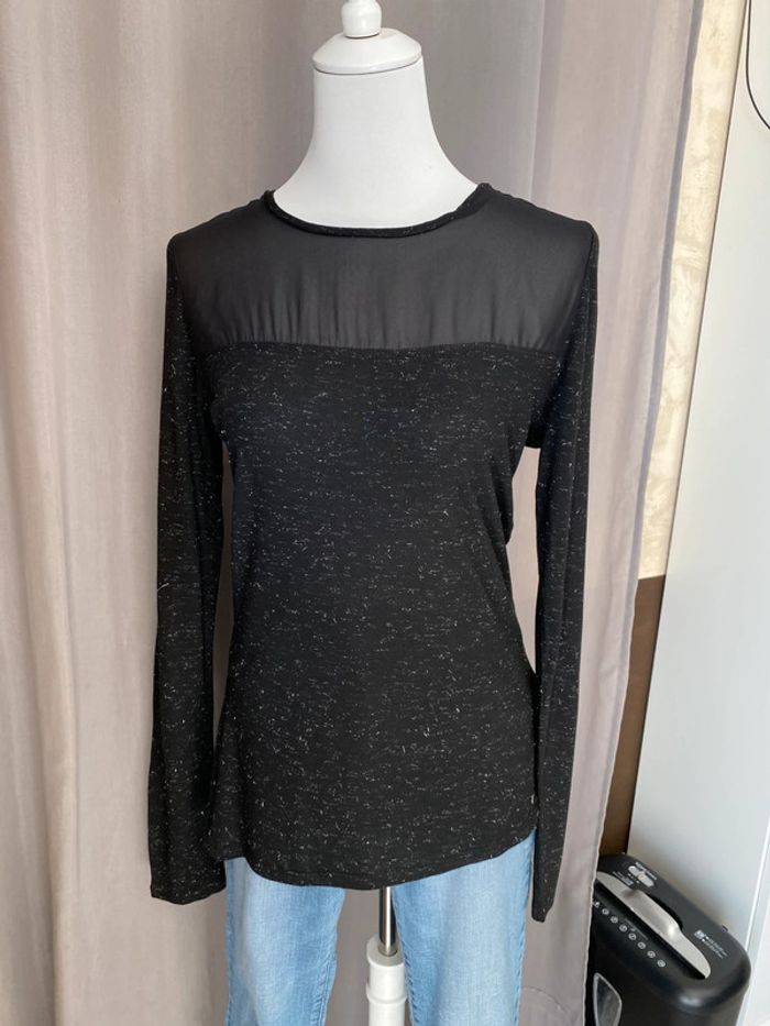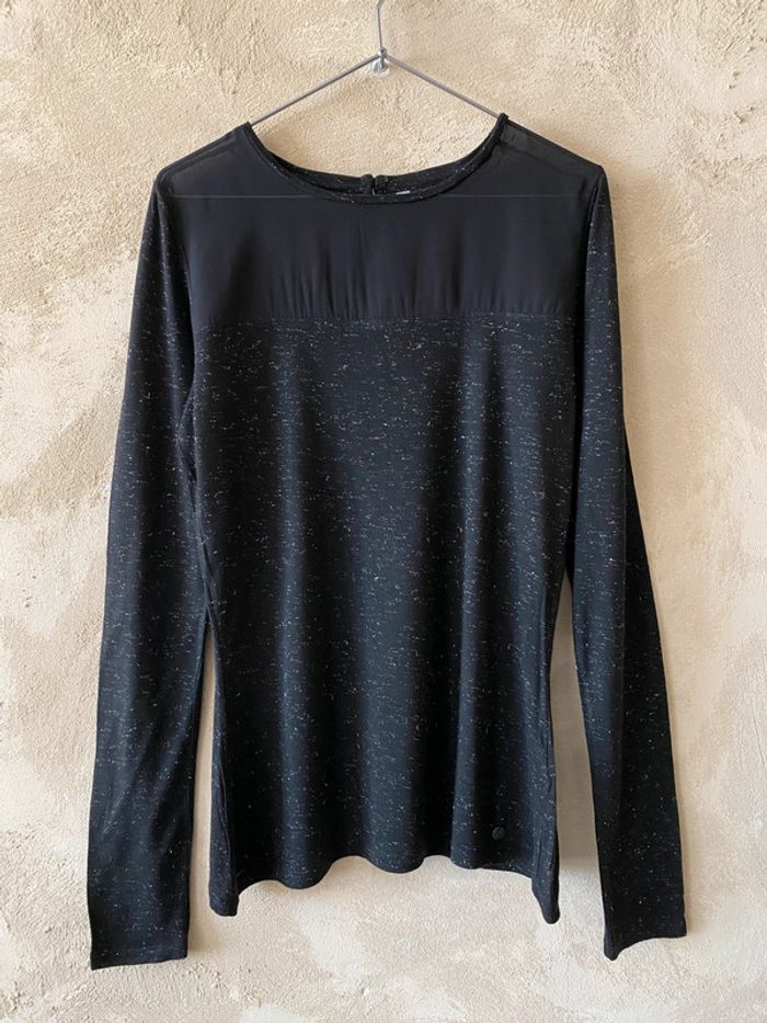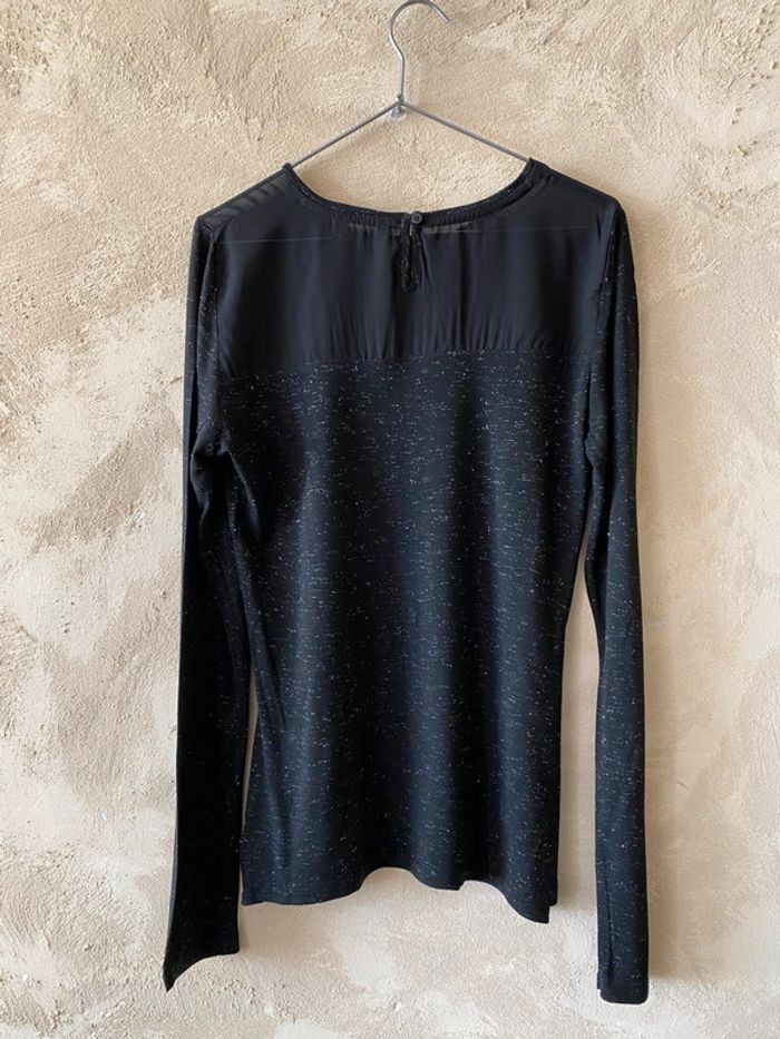 Top manches longues noir fils argenté Kaporal L Plastron en voile, jeu de transparence Largeur épaule 38 Largeur poitrine 47 Longueur manche 72 Longueur dos 64