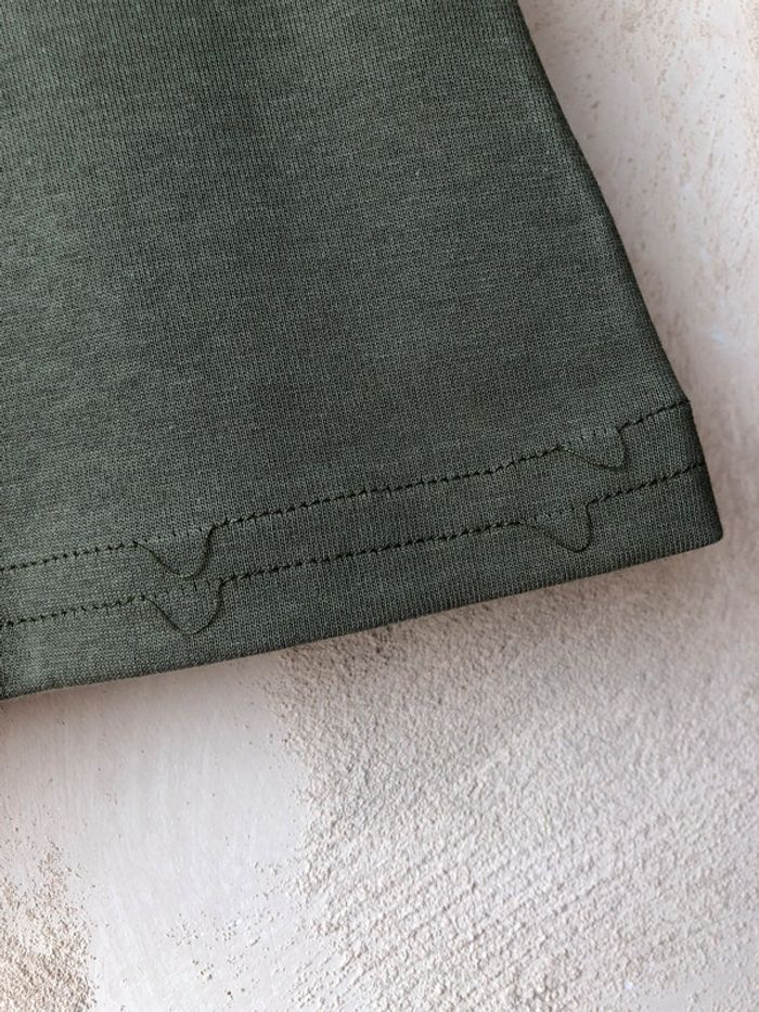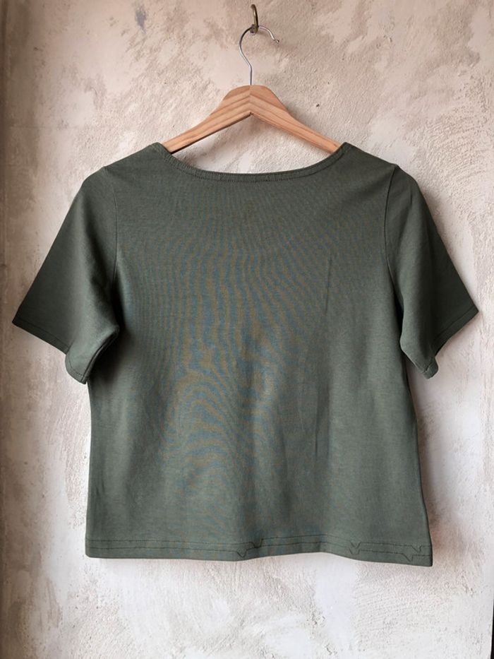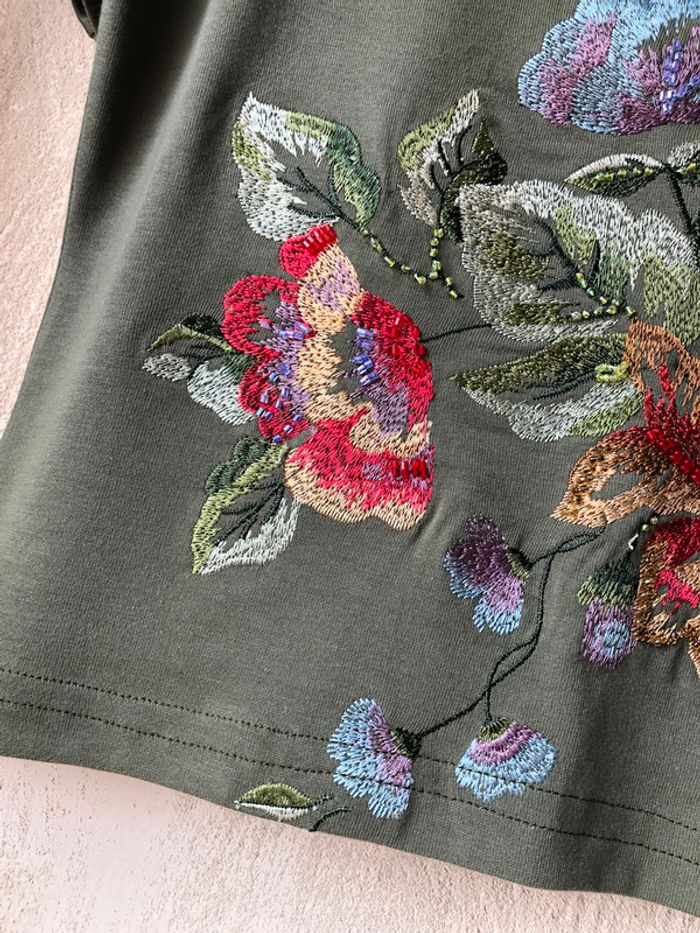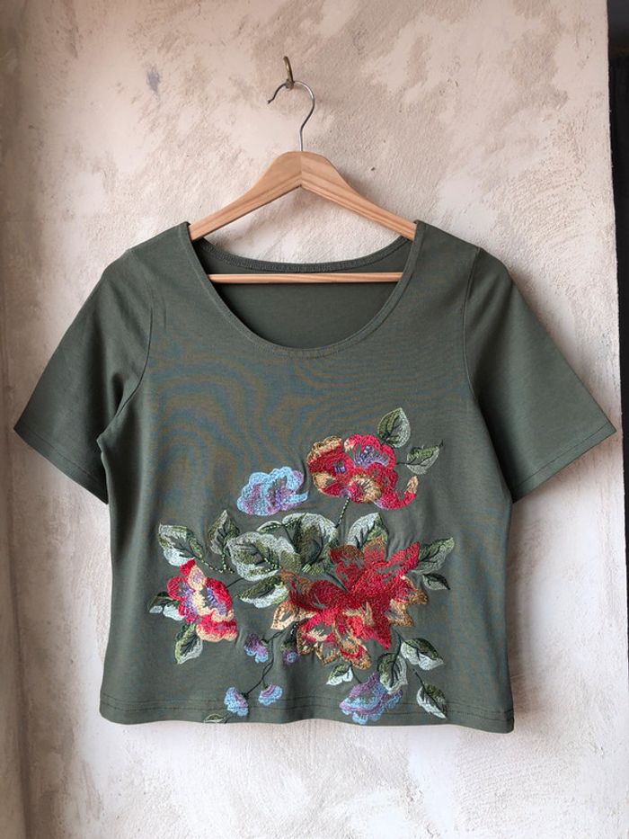 joli t-shirt Crop top kaki brodé vintage M/L col rond très légère trace en haut du dos largeur épaules 34,5 largeur poitrine 47 longueur 50