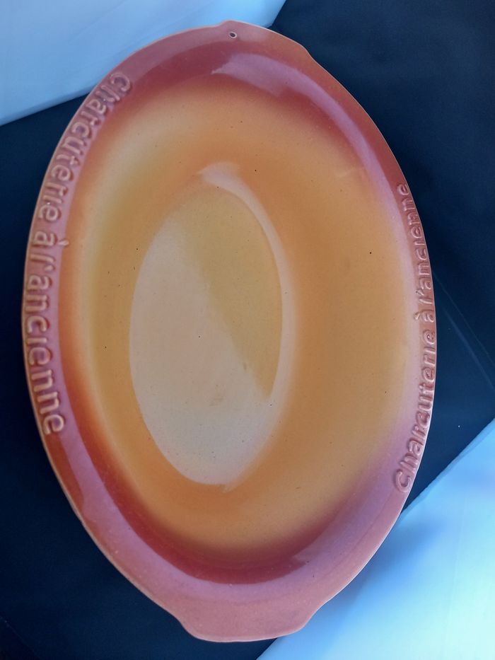 Plat pour terrine ou autre Matière céramique Couleurs marron et jaune Marqué charcuterie à l'ancienne En très bon état Dimensions approximative 10cm de haut : 37cm de long : 25,5cm de large