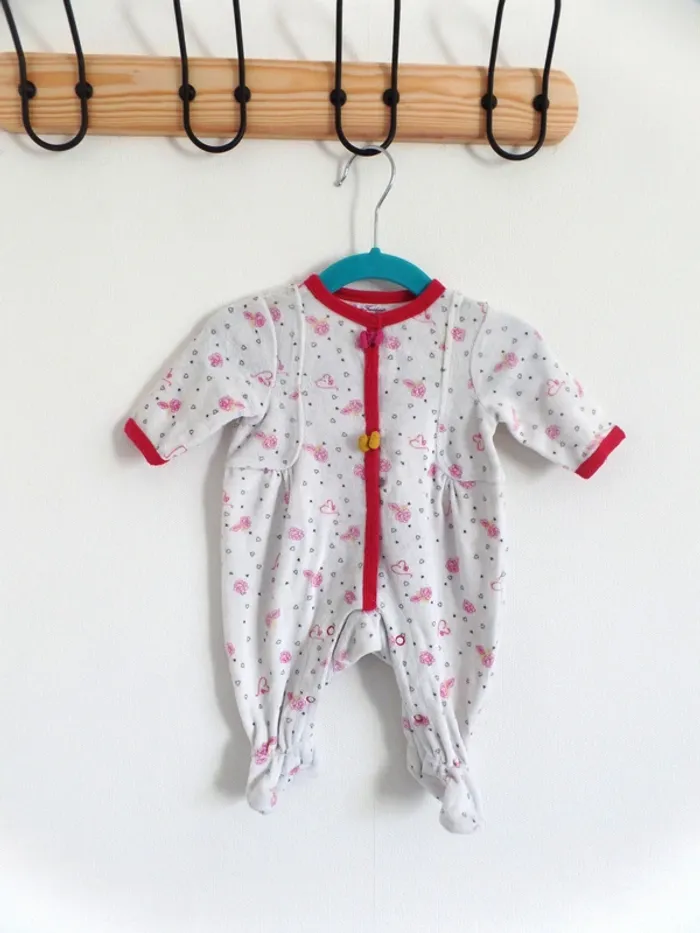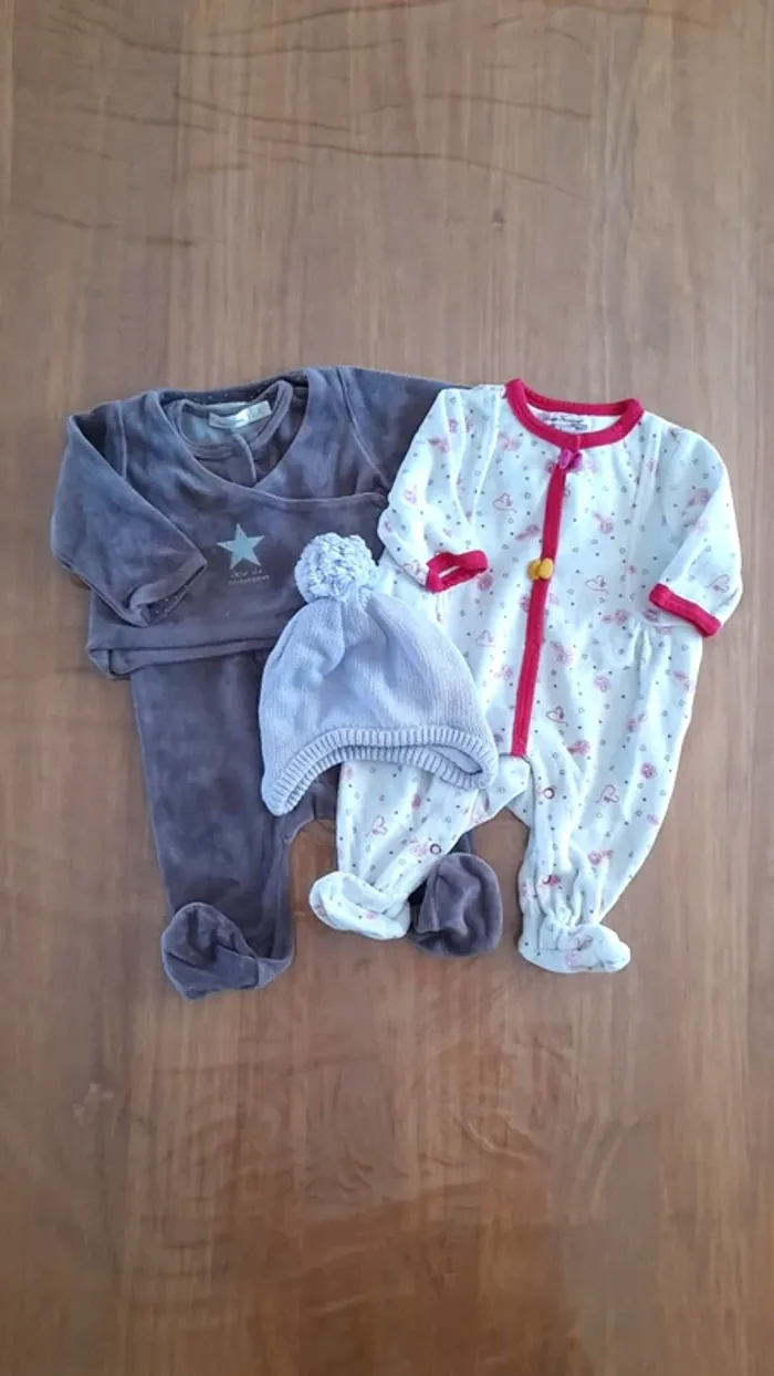 2 pyjamas velours et 1 bonnet en laine Pyjama gris Bout'chou Ouverture sur le devant Pyjama blanc Orchestra Ouverture sur le devant Imprimé cœurs #tinkycindy_1mois #Grenouillere #PyjamaBébé #1Mois #PyjamaBebe #Orchestra #OuvertureDevant #Boutchou #PyjamaVelours