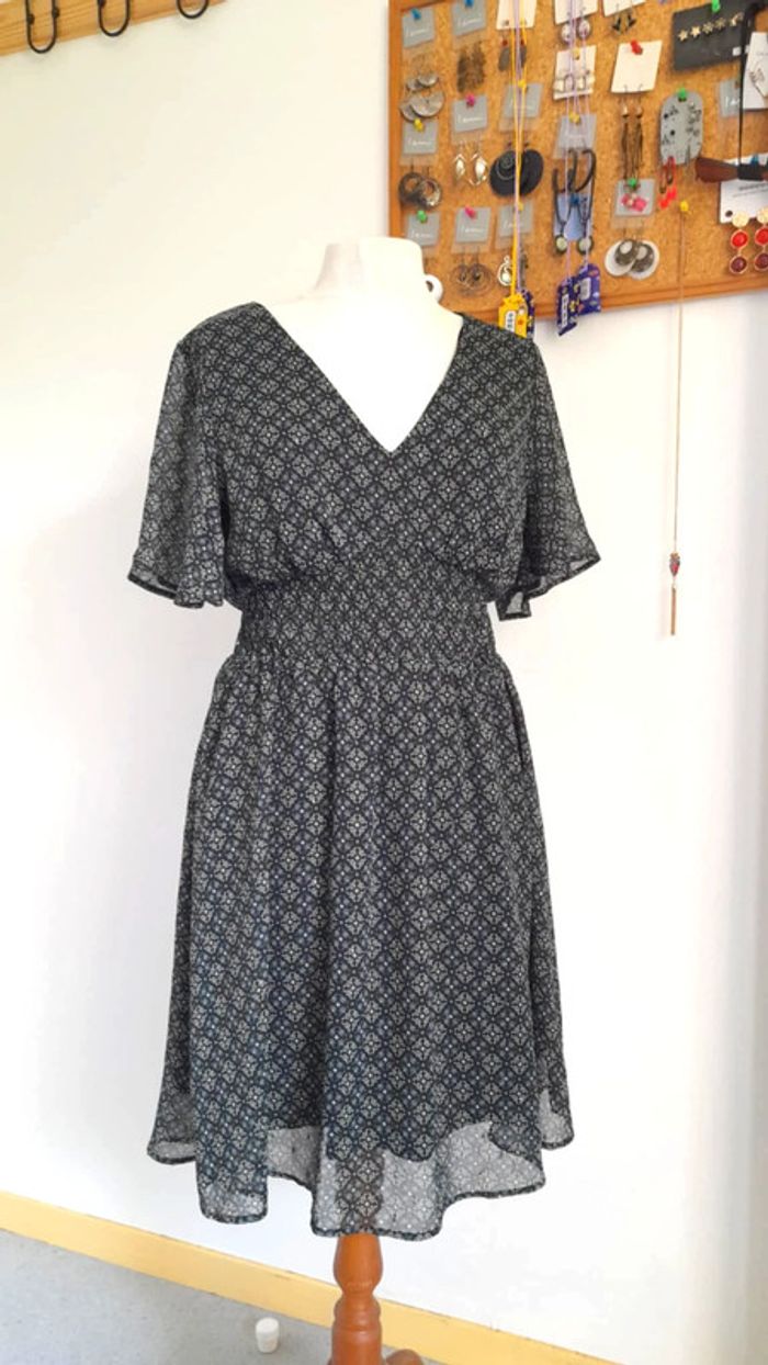 Robe courte évasée entièrement doublée Matière fluide et agréable à porter Imprimé géométriques Taille smockée Col en V et coupe évasée Manches courtes volantées Taille L #tinkycindy_femme #tinkycindy_L_femme #robefemme #robetailleL #robefleurie #robepourété #robeévasée #cachecache #robecachecache #cahecachetailleL