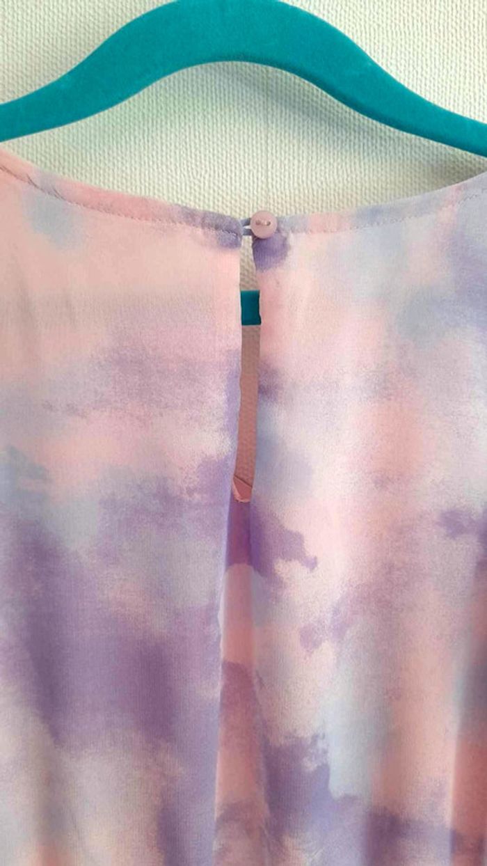 Robe en tissu aérien avec manches volantées Encolure en V avec ouverture dans le dos avec un bouton sur la nuque Élastique à la taille et jupe légèrement évasée Un cordon vertical décoratif pour un effet drapé en bas Longueur genou Couleur rose clair et mauve motif batik Taille 9/10 ans #tinkycindy_9ans #robefillegenou #roberoseclair #robefillelégère #robefilleété #robefille9ans #jolierobe #robemanchescourtes #batik #tieanddye