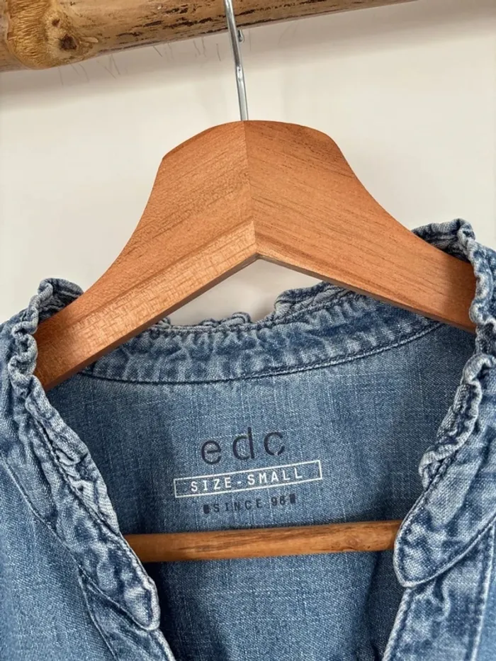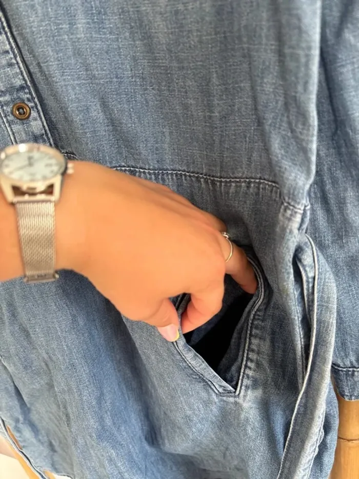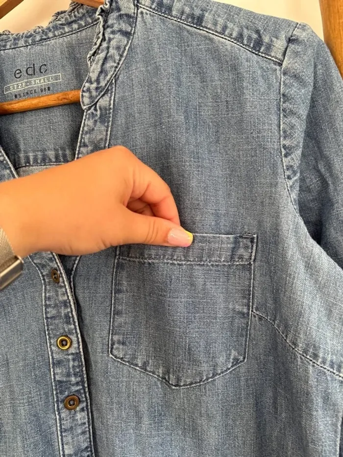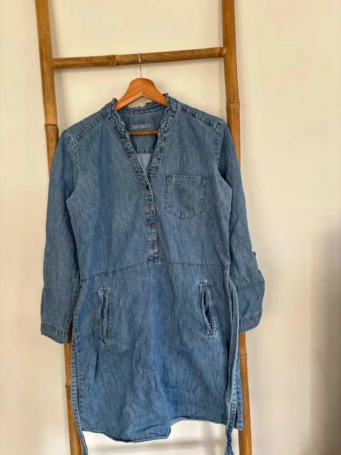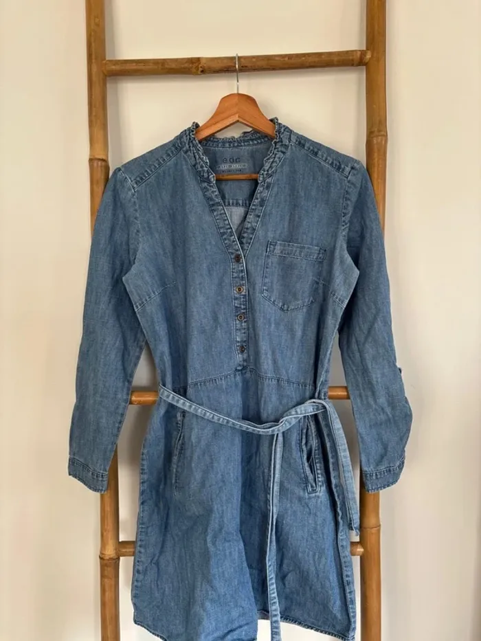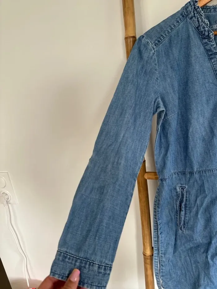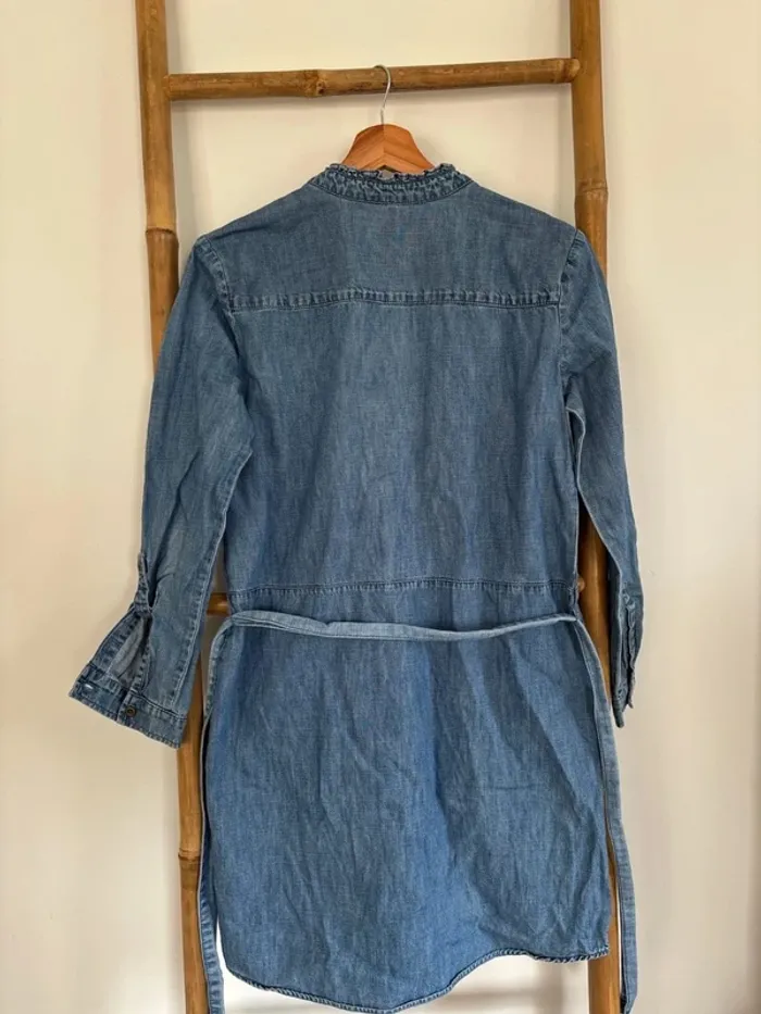 Robe en jean avec un joli col V à froufrous Munie de 2 poches + une 3e au niveau de la poitrine Avec ceinture boutons sur le devant ainsi que sur les manches En excellent état EDC taille S