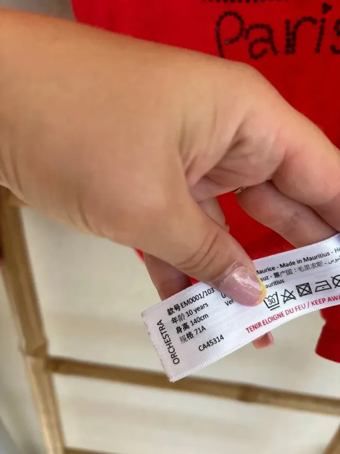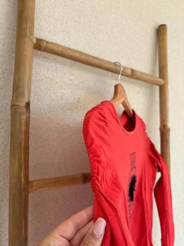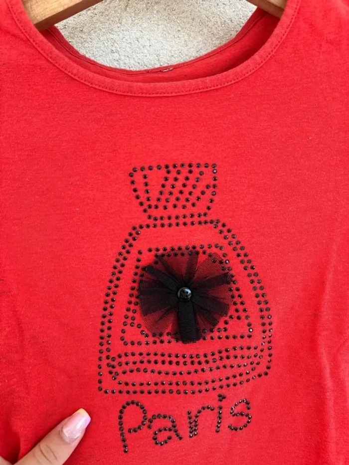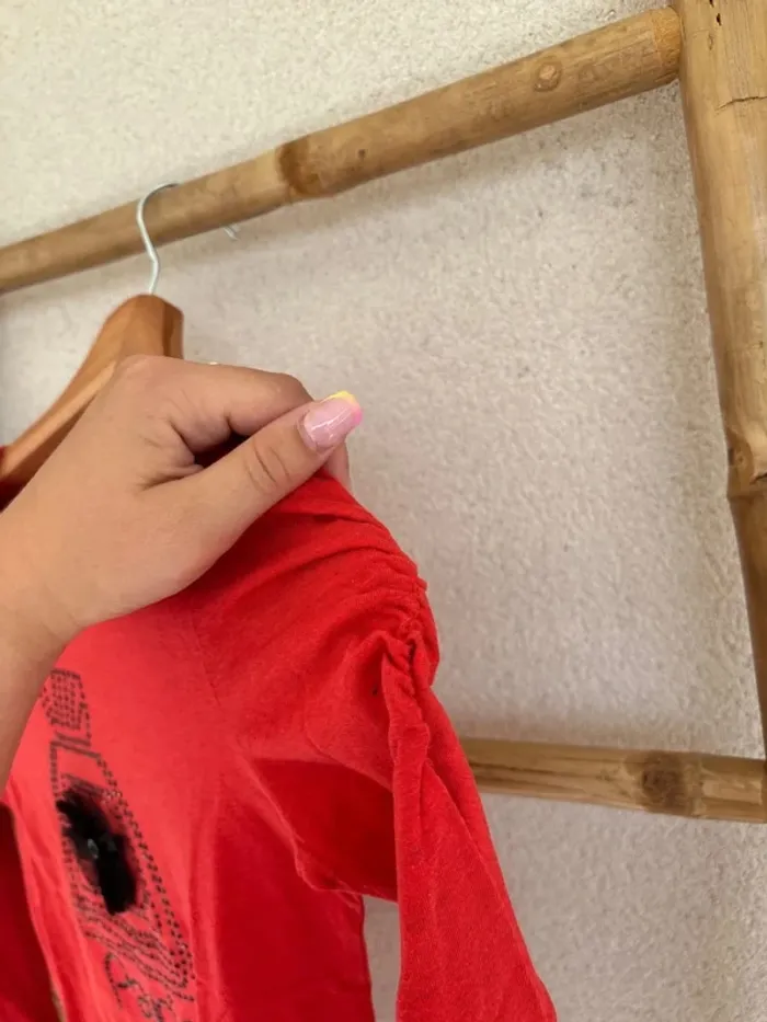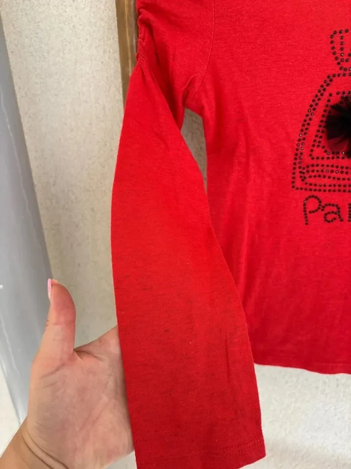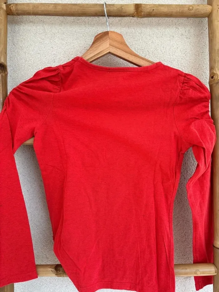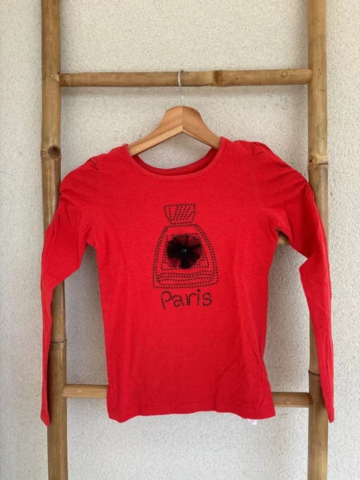 t shirt rouge à manches longues tous les strass sont présents petit froufrou très bon état orchestra taille 10 ans