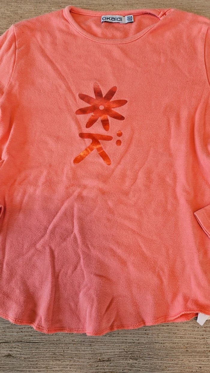 T shirt pour fille de couleur orange clair avec un signe chinois sur le devant. Très peu mis. Convient bien pour du 9 à 10ans #deborahtock_10ans