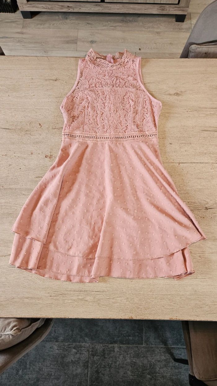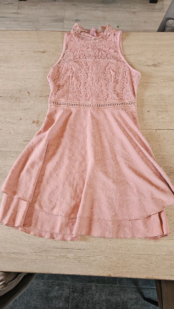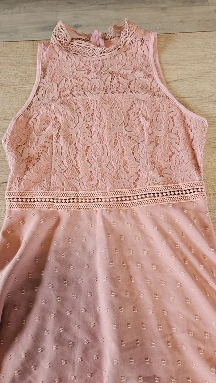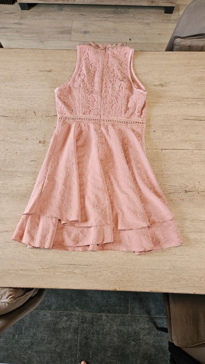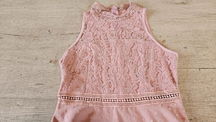 Jolie robe vieux rose qui allie broderie et dentelle.elle se ferme par 1 tirette à l arrière.le haut est élastique et moulant le bas est légèrement asymétrique et evasé. Etat impeccable car ma fille l a mise 1 ou 2 heure pour un cocktail. Mesure 40 cm d aisselle à aisselle et 37 cm à la taille. Attention, ma fille a retiré les étiquettes #deborahtock_femmeXS #deborahtock_femmeS
