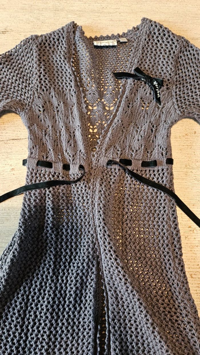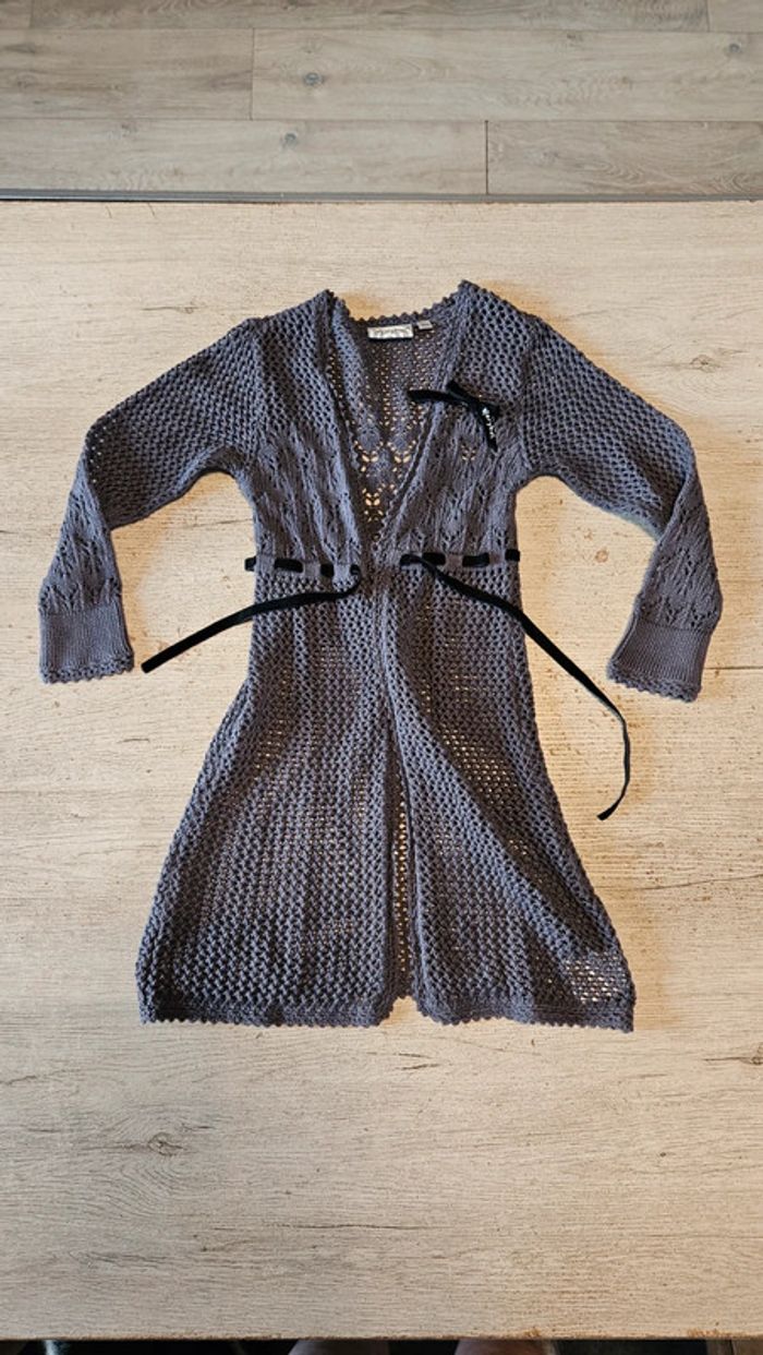 Très joli gilet long. Il est de couleur gris foncé avec des reflets mauves. A peine mis 1 heure donc excellent état. Convient pour du 3 à 5 ans. Peut se ferme avec un cordon à la taille en satin noir. Très bel effet #deborahtock_4ans