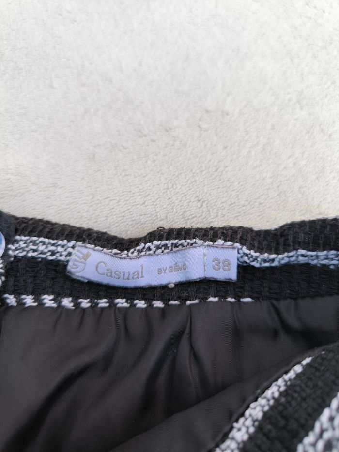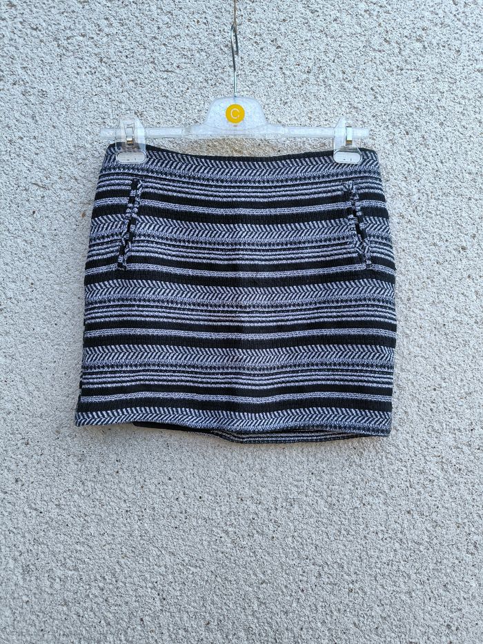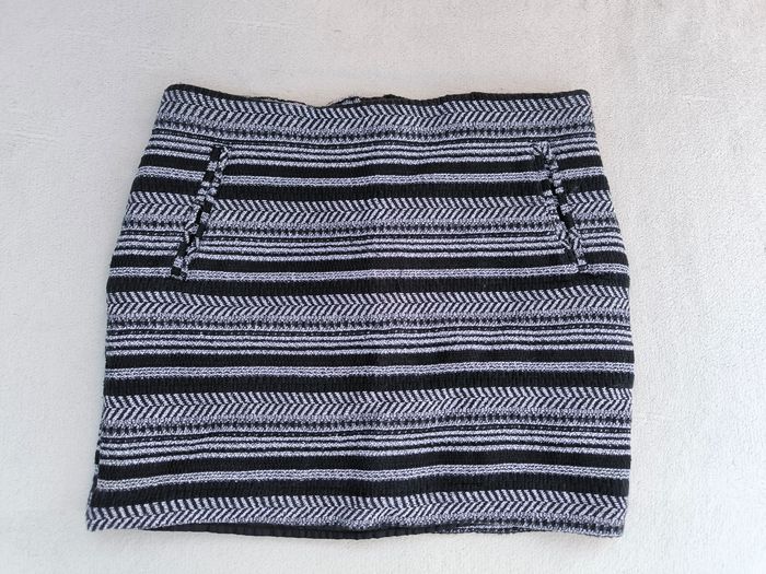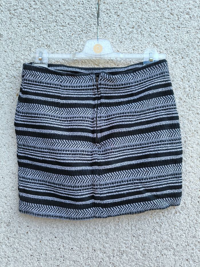 Jupe courte d'hiver Marque Gémo Taille 39 • Coloris noir, blanc • Rayures horizontales, motifs • Fermeture éclair au dos • 2 poches • Doublure Largeur taille non étirée : 37 cm Largeur taille étirée au maximum : 40 cm Longueur totale : 36 cm En très bon état #evelyne_taille_38