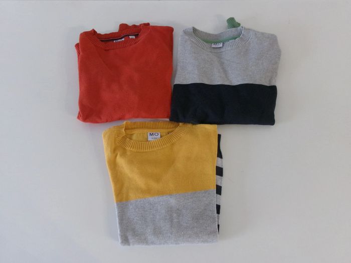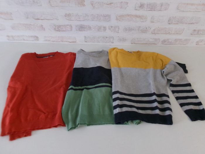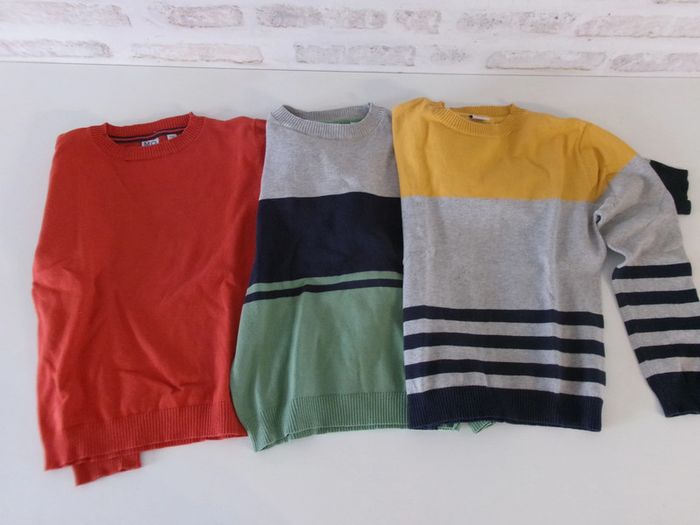 Pull garçon mi-saison 7/8 ans en bon état. Le pull couleur rouille a besoin d'un petit point de couture au niveau du col, une éventuelle petite tâche sur la manche gauche vers l'arrière, devrait partir au lavage, le vert a une petite tâche de feutre sur l'avant bras droit et arrière gauche, je pense devrait partir avec du détachant.