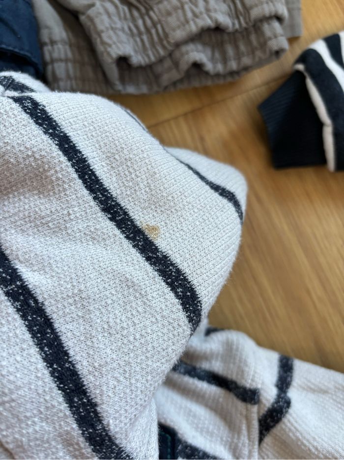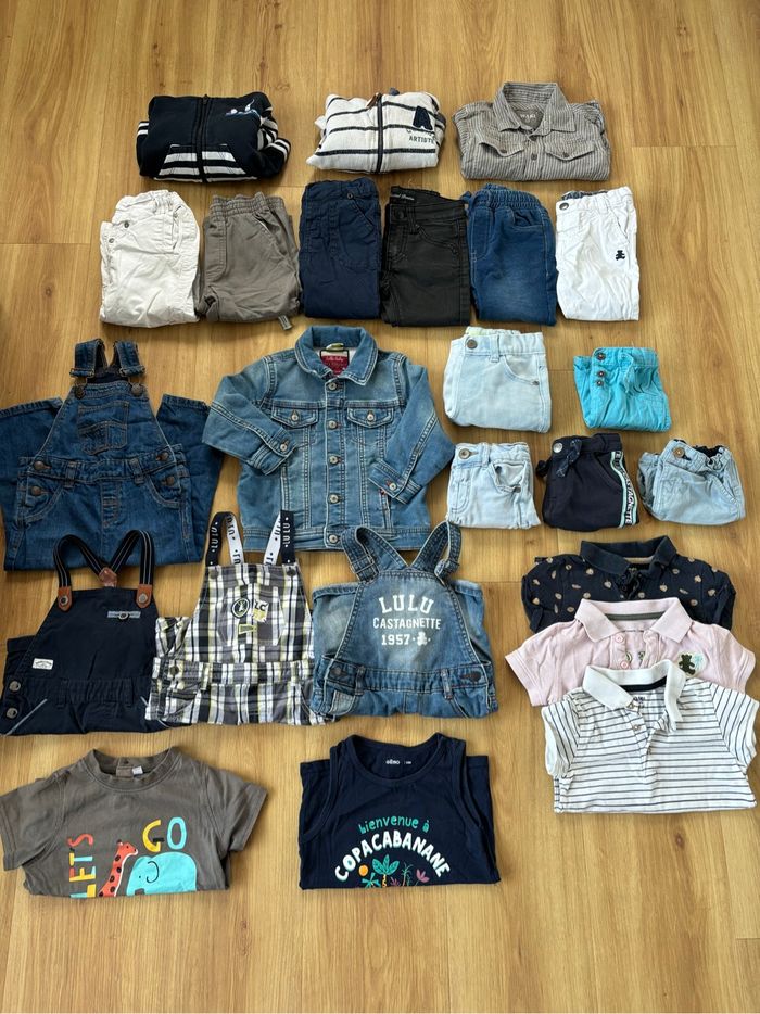Lot comprenant : -2 gilets -1 veste en jean -1 chemise -6 pantalons/jeans -5 shorts -4 salopettes (3 shorts et 1 pantalon) -3 polos -1 débardeur -1 t-shirt Diverses marques Certains vêtements contiennent quelques petites tâches (semblables aux photos, il manque quelques photos de certaines tâches(annonce limitée à 10 photos).