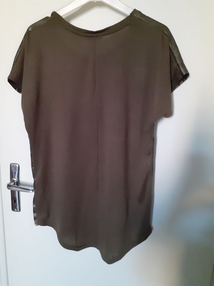 Vends un top manches courtes, tissu satiné devant et mat derrière, couleur kaki, arrondi à la base, plus long derrière que devant, 100 % polyester, marque Zeeman, taille 36. Longueur devant 56 cm Longueur derrière 68 cm.