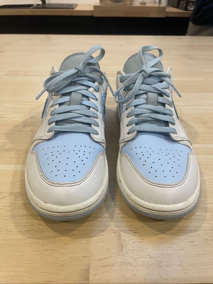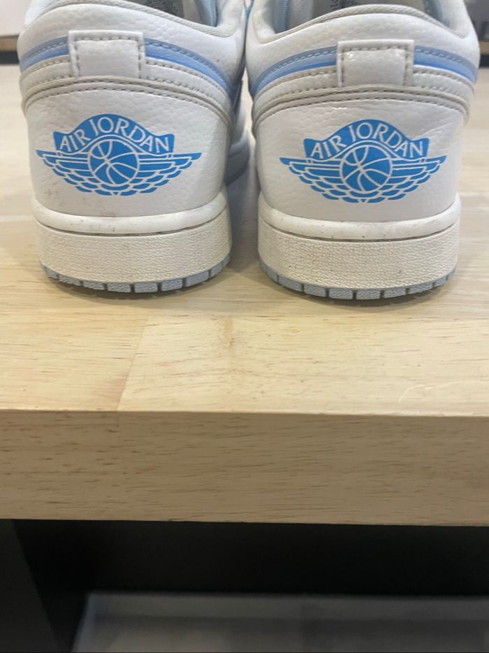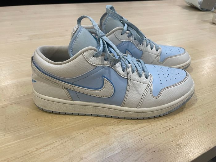 Vends paire de baskets blanc et bleu ciel, de marque et modèle Nike Air Jordan, pointure 42, en très bon état, à l’état neuf, très peu portées. Valeur neuve : 240€